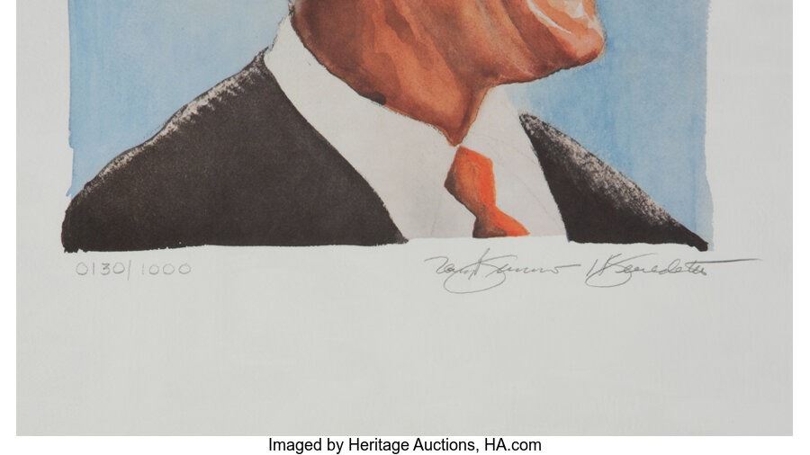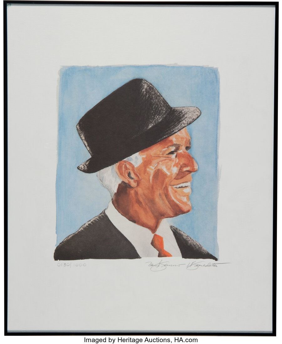Tony Bennett Signed "Frank Sinatra" Limited Print. House in a nice black frame, this is a print of an original painting the great Tony Bennett made of Ol' Blue Eyes, numbered and signed. The print depicts the singer in profile as he wears an orange necktie (his favorite color) and a black Porkpie hat. Signed in pencil on the lower margin "0130/1000 Tony Bennett / A. Benedetto." Framed to an overall 18 ¼" x 22 ¼". In Near Mint Minus condition with a small crack in the upper left corner of the frame. COA from Heritage Auctions.