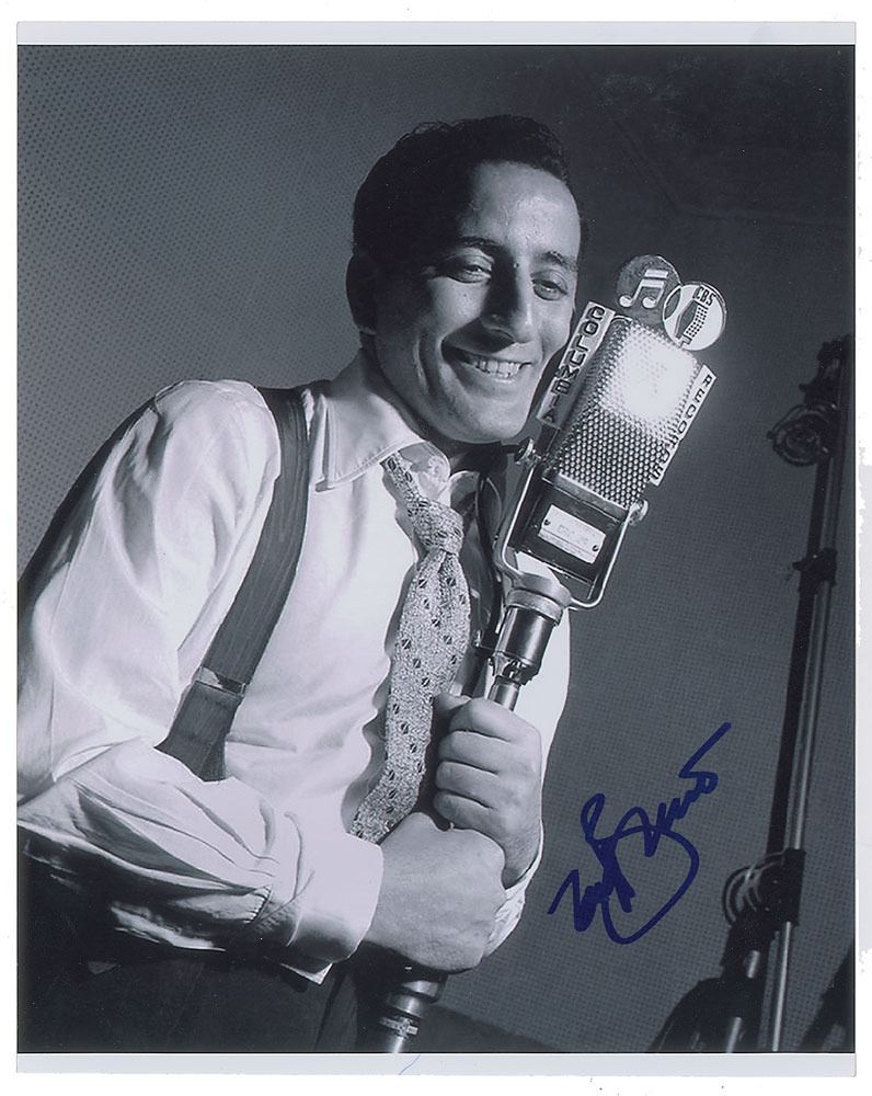 Glossy 8 x 10 half-length photo of a young Tony Bennett smiling and holding a Columbia Records microphone stand, signed in blue felt tip. In fine condition. Accompanied by a John Brennan Collection letter of provenance.