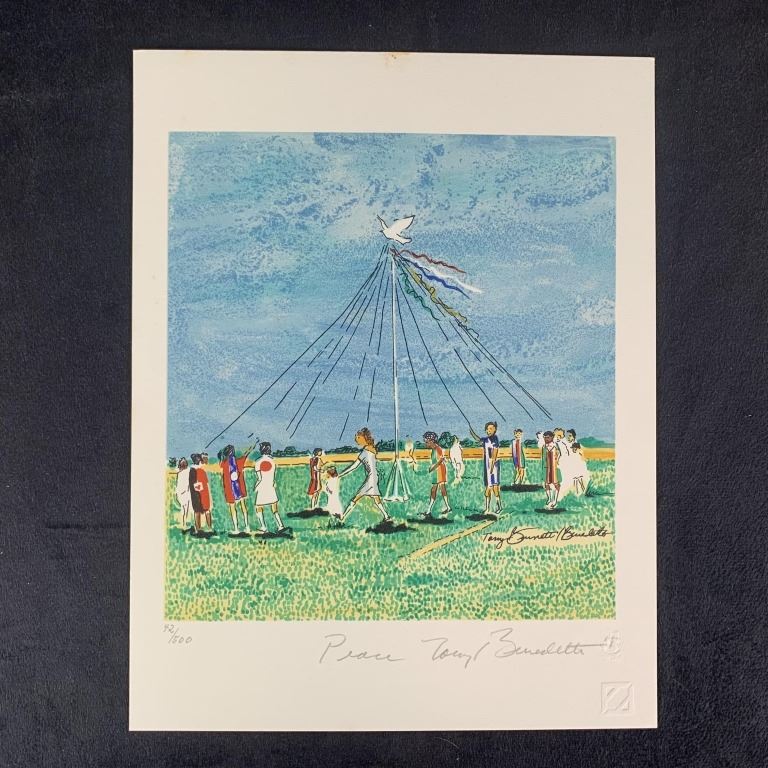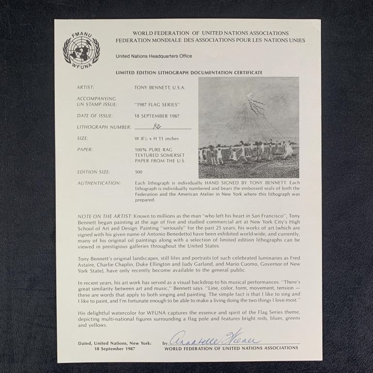 Tony Bennett's "1987 Flag Series" limited edition print, signed lower right and numbered 42/500 lower left. This piece is of childrean walking around in a circle all holding the edge of a parachute, while a white dove suspends it in the air. This print is in excellent condition with minor colour stain at top, and is included with a certificate of authenticity from the World Federation of United Nations Associations.