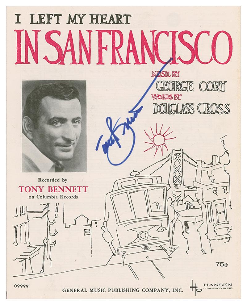 Sheet music to his classic ‘I Left My Heart in San Francisco,’ 8.5 x 10.5, two pages, signed on the front cover in blue felt tip. In very fine condition.