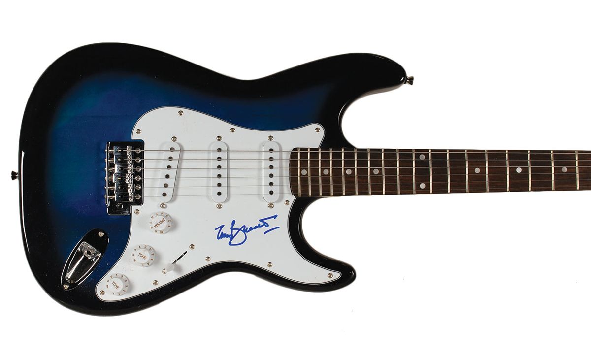 Two-toned blue-bodied Stedman Pro ‘stratocaster-style’ electric guitar, signed on the white pickguard in blue felt tip. In fine condition. Oversized.