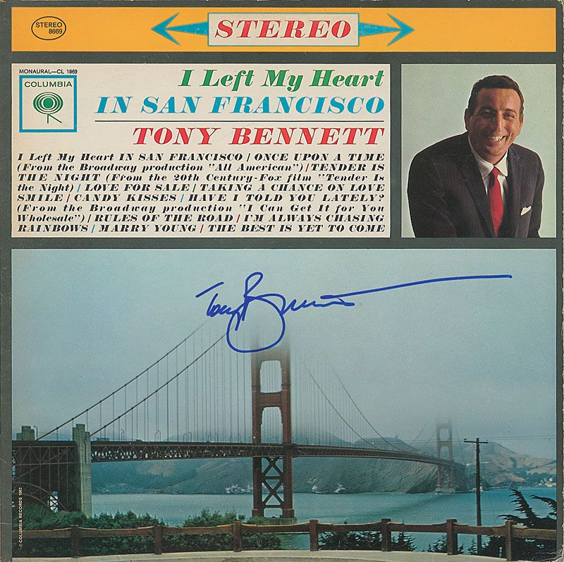 I Left My Heart in San Francisco album signed on the front cover in blue felt tip. General wear and separations to spine and edges, otherwise fine condition. The record is included.