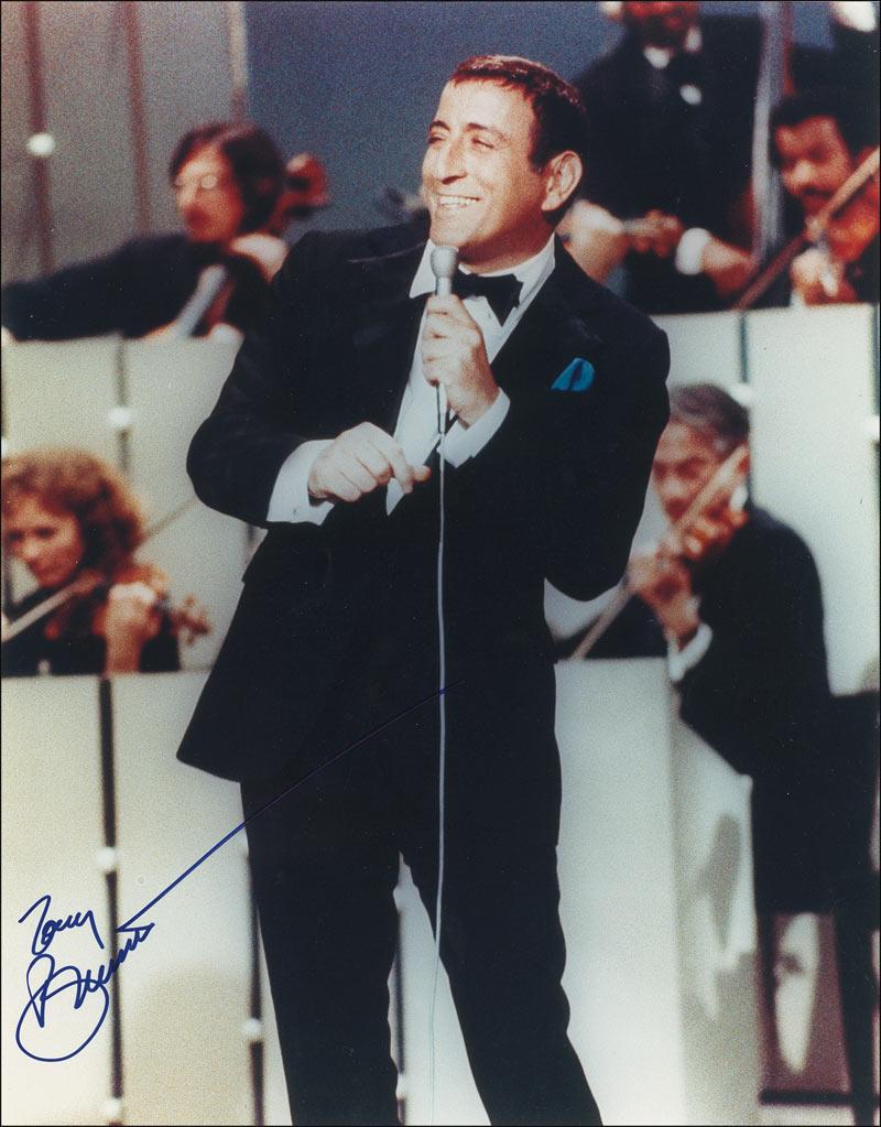 Color glossy 10.25 x 13.25 photo of Bennett at the microphone, signed in-person in blue felt tip. In fine condition, with a few light surface impressions. Pre-certified PSA/DNA and RRAuction COA.