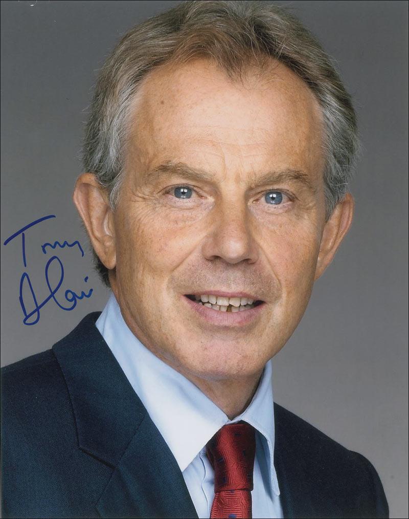 Two identical color satin-finish 8 x 10 head-and-shoulder photos of Blair, each signed in blue felt tip. In fine condition.