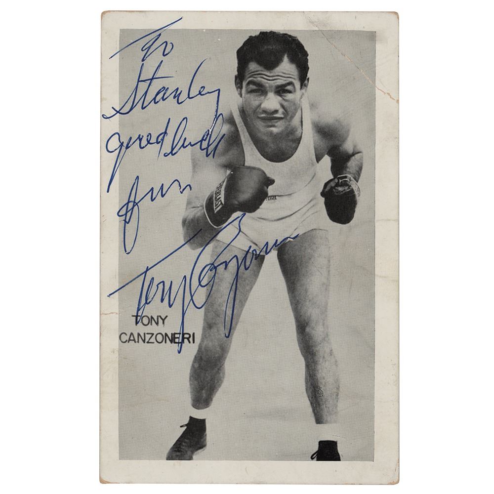 Welterweight boxer (1908-1959) who was one of the members of the exclusive group of boxing world champions who have won titles in three or more divisions. Vintage semi-glossy 3.5 x 5.5 postcard photo of Canzoneri in a pugilistic pose, signed and inscribed in ballpoint, "To Stanley, good luck, from Tony Canzoneri.” In very good to fine condition, with a crease to the upper right corner.