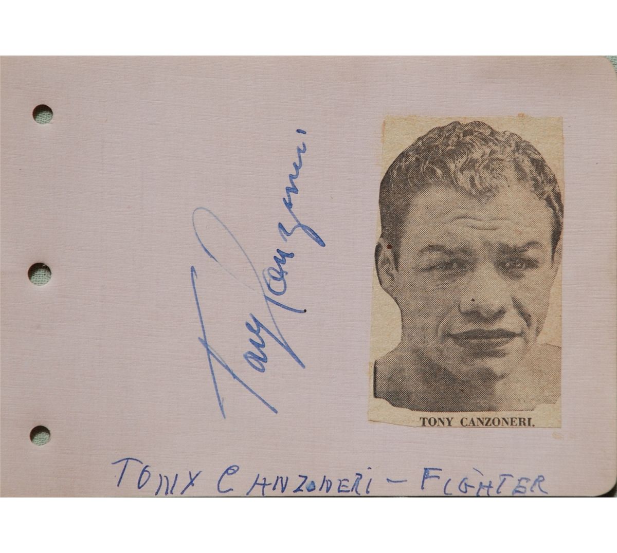 Vintage fountain pen signature on light pink album page signed "Tony Canzoneri" with small paper photo attached. Canzoneri was a three-time world champion and held a total of five world titles. He is a of the member of the exclusive group of boxing world champions to who have won titles in three or more divisions.