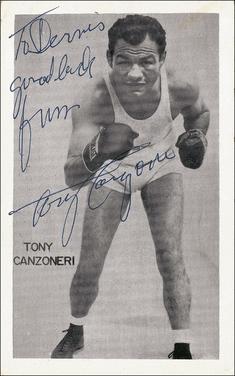 Welterweight boxer who was one of the members of the exclusive group of boxing world champions who have won titles in three or more divisions. Vintage 3.5 x 5.5 postcard photo, signed and inscribed in blue ballpoint “To Dennis, good luck from Tony Canzoneri.” In fine condition, with some mild toning to top portion. Pre-certified Steve Grad/PSA/DNA and RRAuction COA.