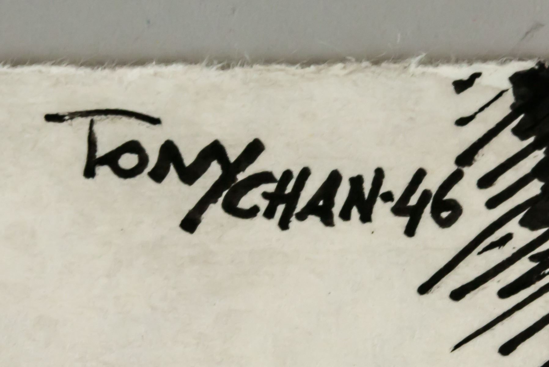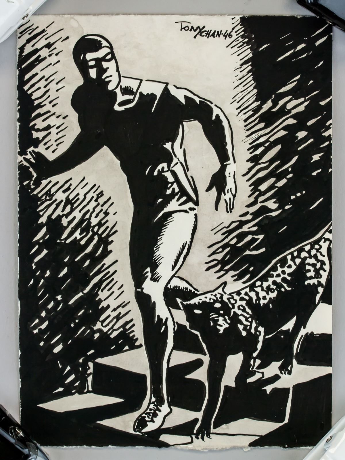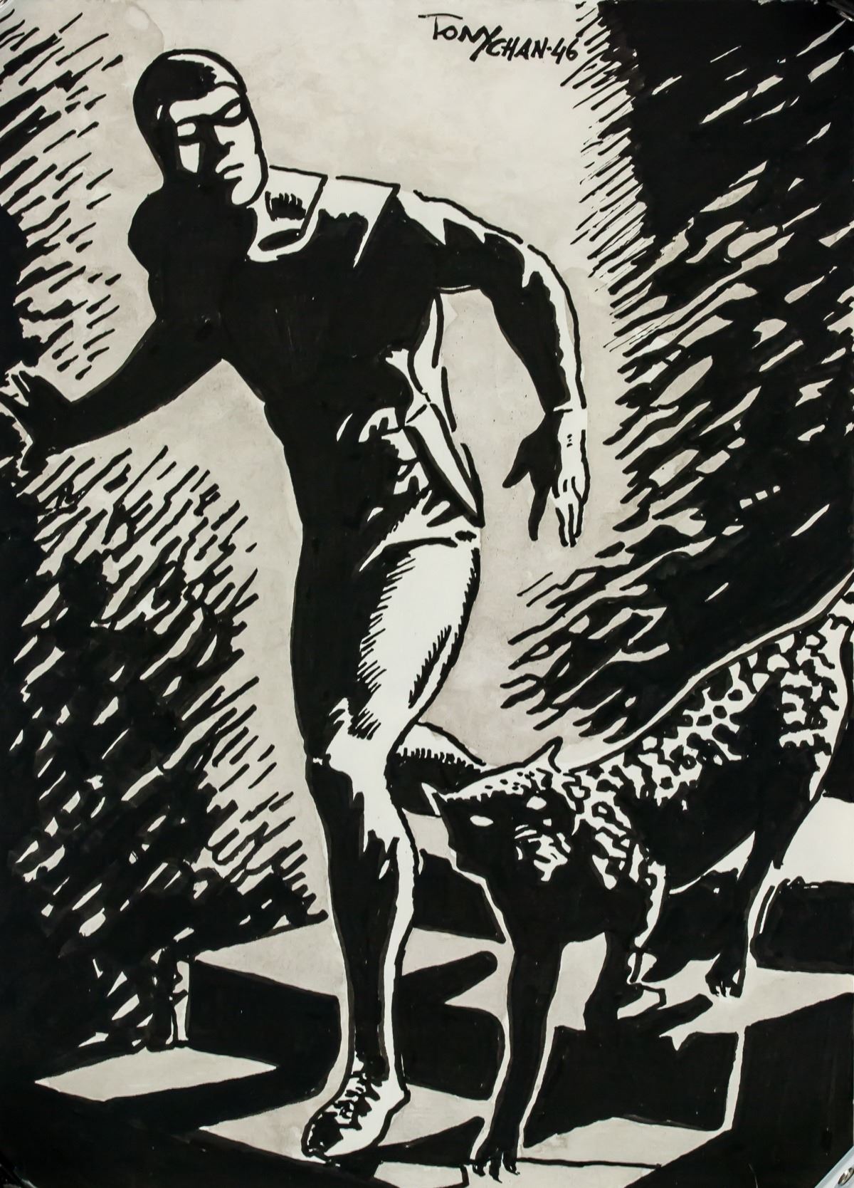Ink on paper. Featuring a comic portrait of a costumed man and giant cat. Signed TONY CHAN-46 near top margin. Inscribed in pencil 1940 on the lower right corner on verso. 18.5 x 13.5 cm (7..3 x 5.3 inches). PROVENANCE: Southern Ontario estate