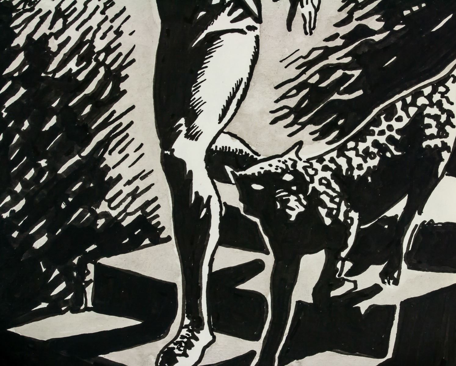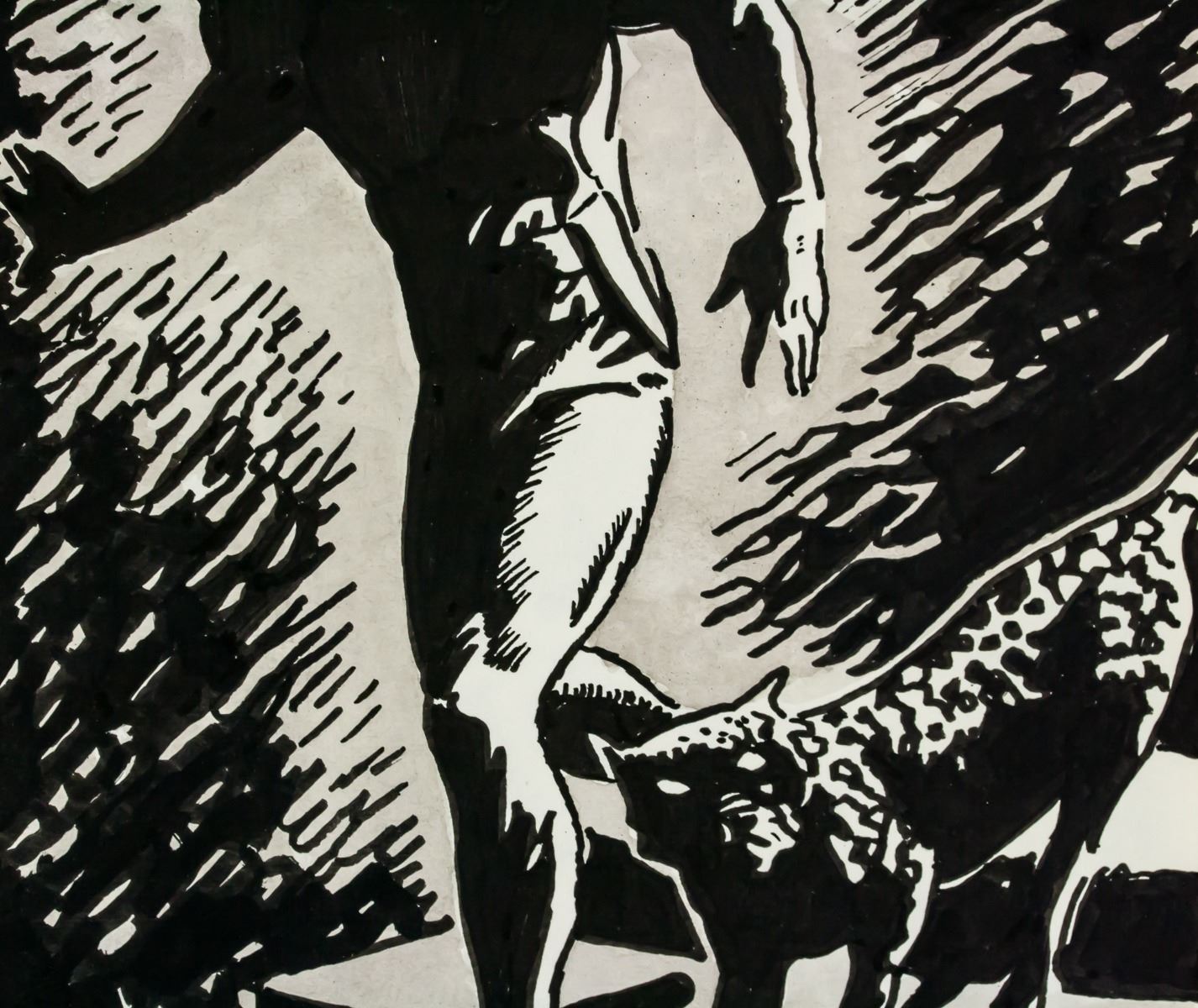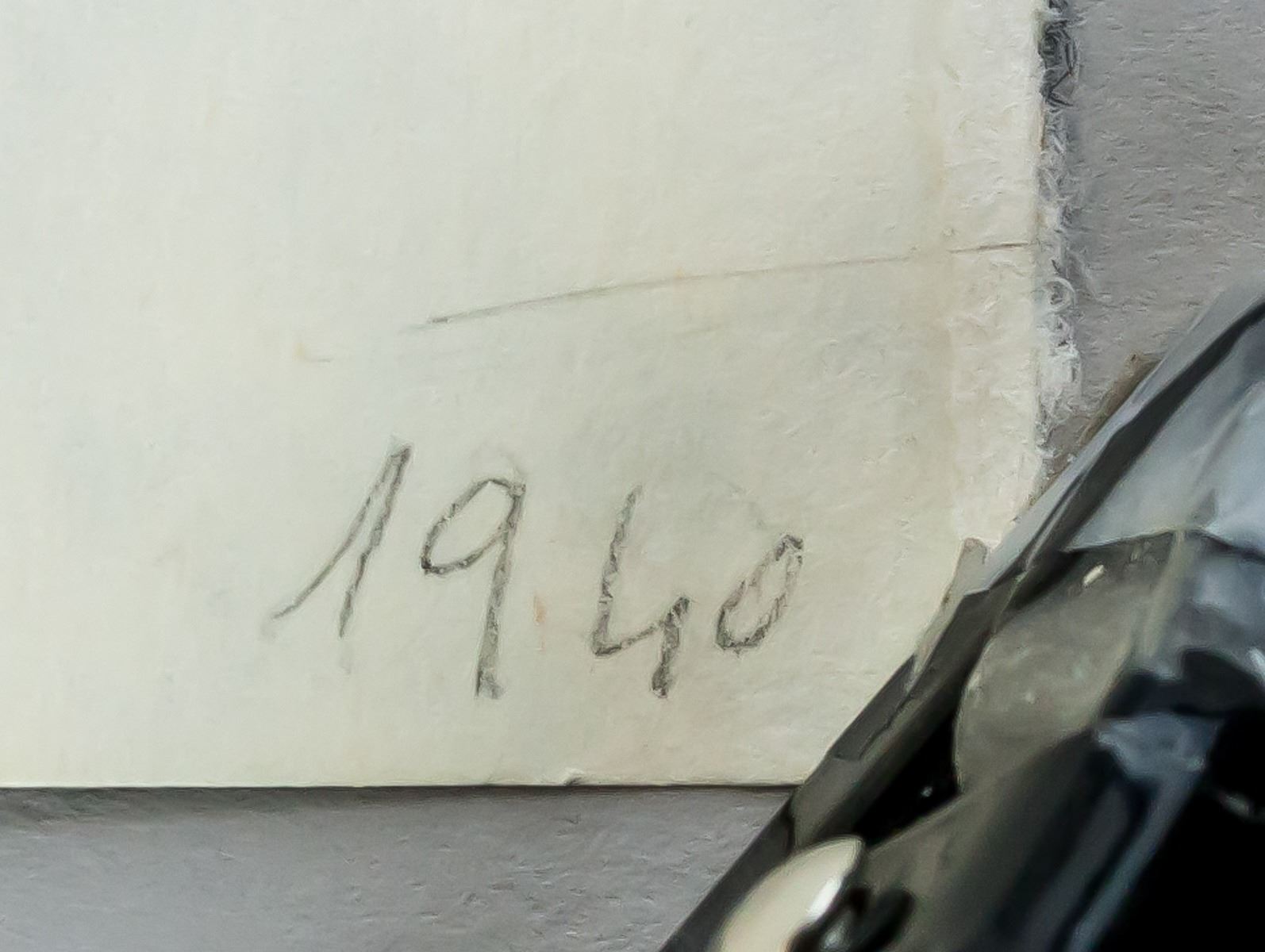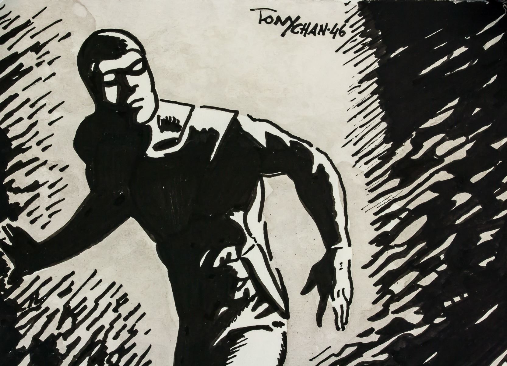 Ink on paper. Featuring a comic portrait of a costumed man and giant cat. Signed TONY CHAN-46 near top margin. Inscribed in pencil 1940 on the lower right corner on verso. 18.5 x 13.5 cm (7..3 x 5.3 inches). PROVENANCE: Southern Ontario estate