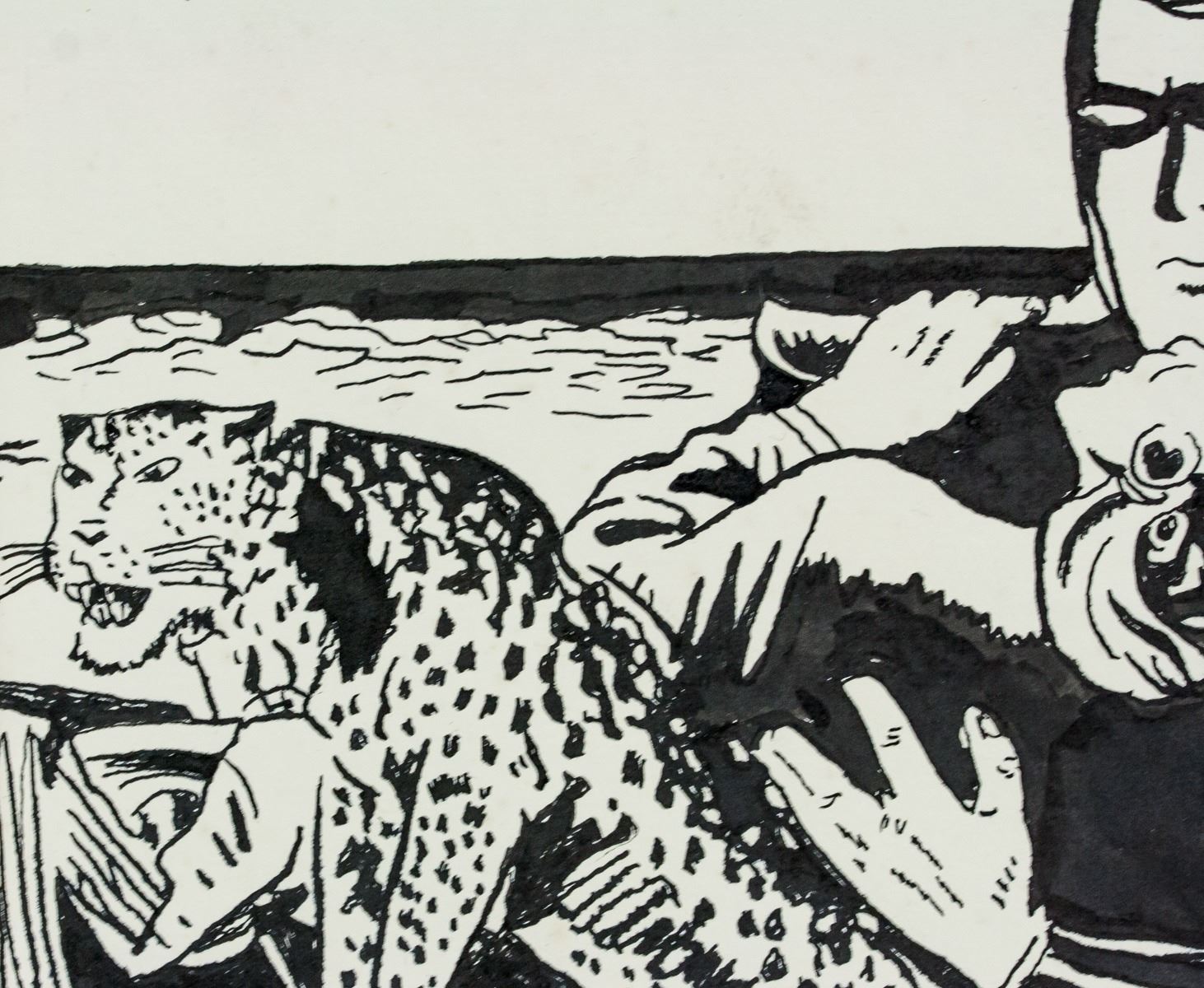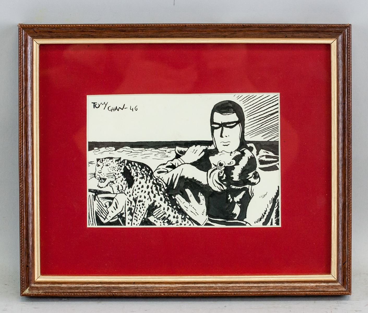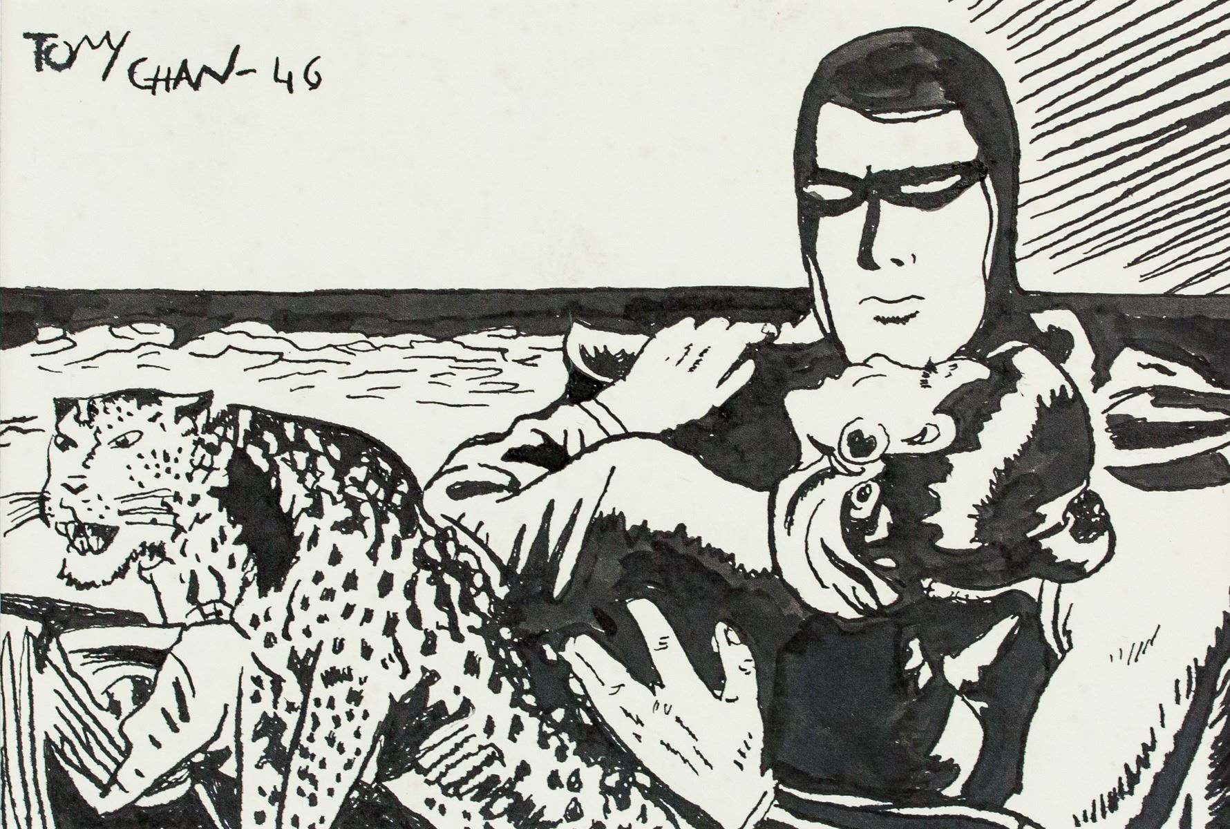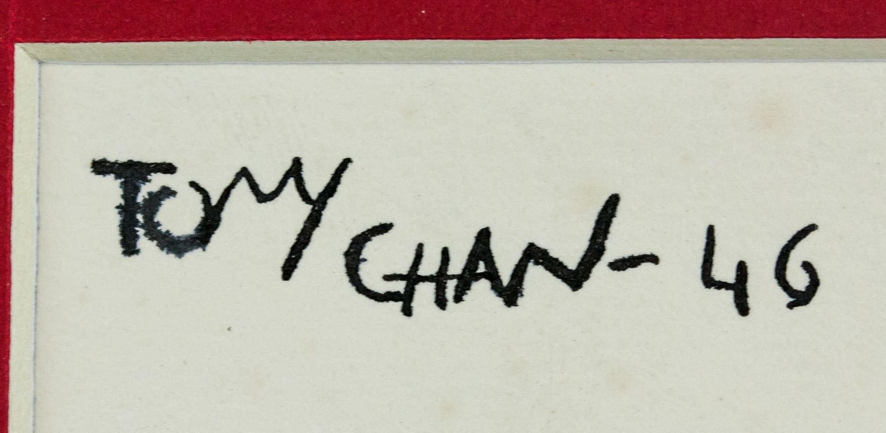Ink on paper, framed. Featuring a couple. Signed Tony Chan-46 on the upper left corner. Inscribed 1940 on the lower right corner, verso. 11 x 16 cm (4.3 x 6.3 inches). Frame size: 23 x 27.5 cm (9.1 x 10.8 inches). PROVENANCE: Southern Ontario estate