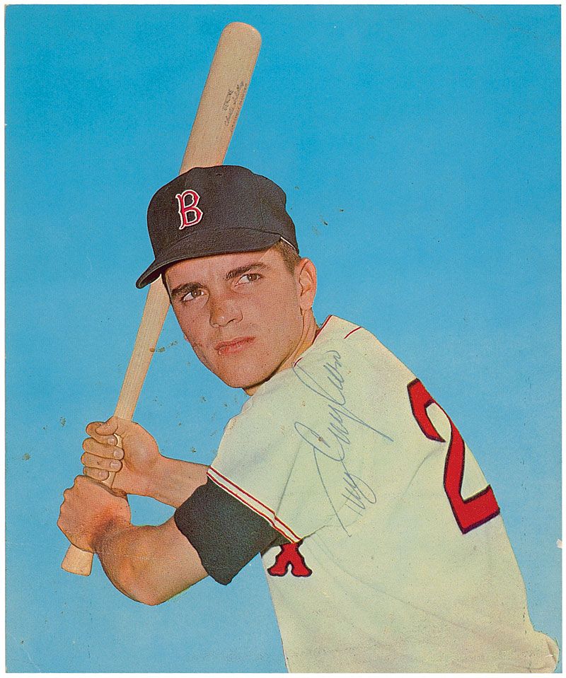 Outfielder (1945–1990) who was hit in the face by a pitch in 1967, causing a severe eye injury and derailing his career. Color 7.5 x 9 cardstock photo of Tony C in his Red Sox uniform, signed in black ballpoint. In very good condition, with horizontal crease to lower portion, some other scattered light creases, and an impression of another signature over Conigliaro’s, apparently from signing another photo on top.