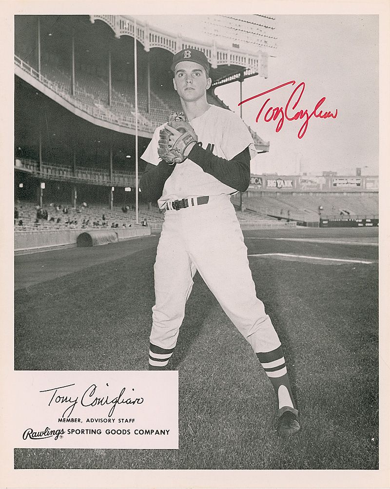 Outfielder (1945–1990) who was hit in the face by a pitch in 1967, causing a severe eye injury and derailing his career. Promotional 8 x 10 paperstock photo of Tony C. posing in Yankee Stadium, issued by Rawlings Sporting Goods, signed in red felt tip. In fine condition.