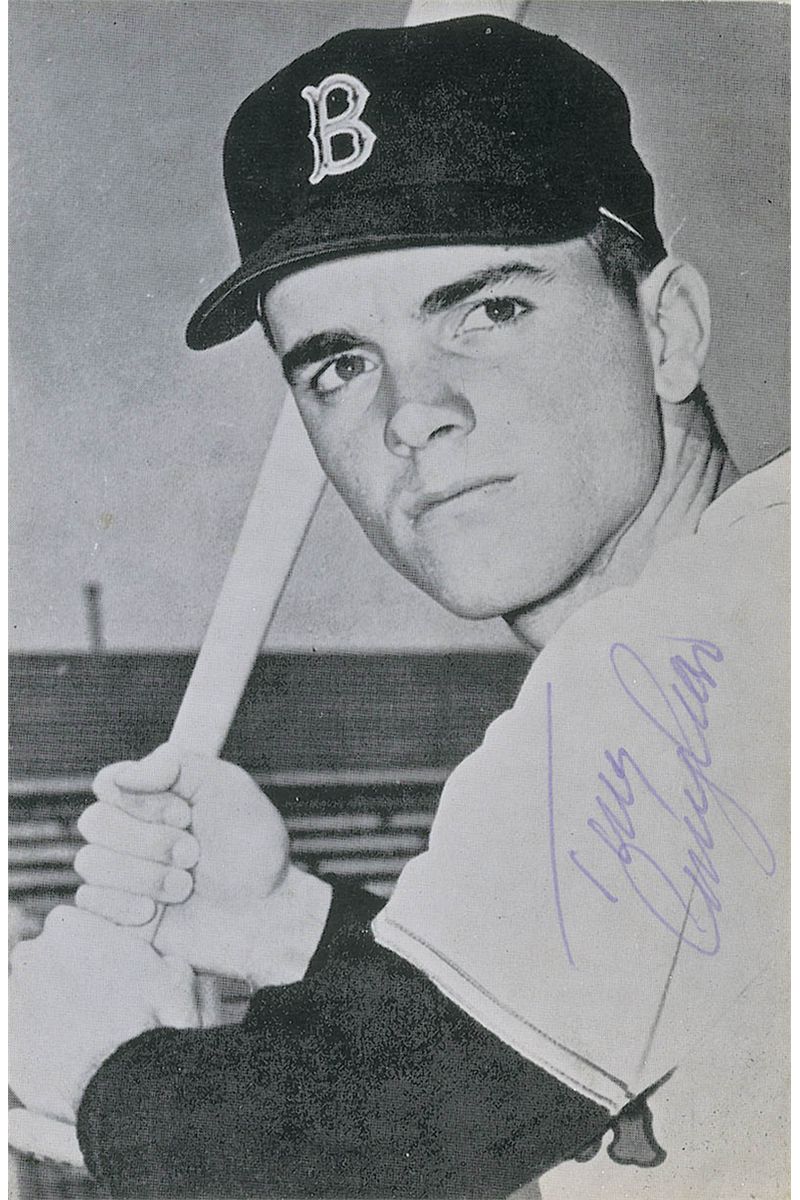 Outfielder (1945–1990) who was hit in the face by a pitch in 1967, causing a severe eye injury and derailing his career. Vintage 3.25 x 5 postcard photo of Conigliaro in his batting stance, signed vertically in blue ballpoint. A crease to left side and some scattered light surface marks, otherwise fine condition.