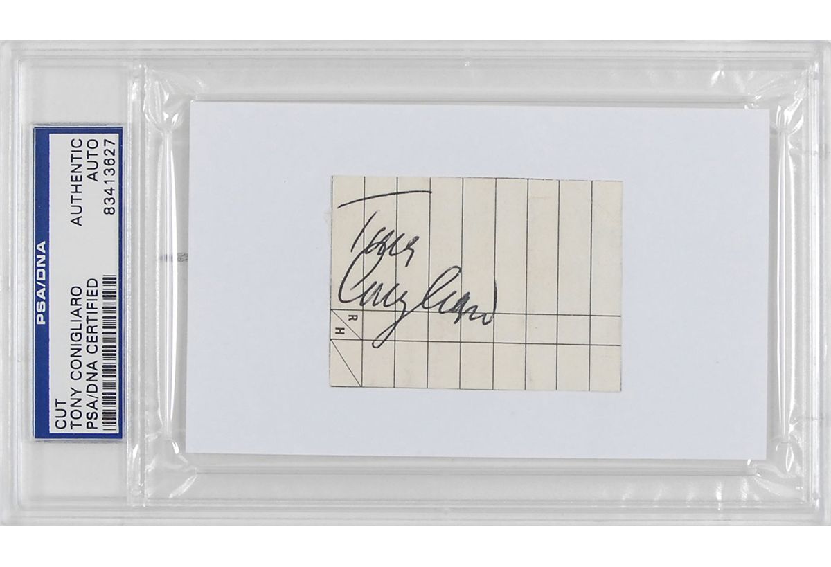 Vintage ink signature, “Tony Conigliaro,” on an off-white 2.5 x 1.75 slip clipped from a scorecard and affixed to a 5 x 3 card. Encapsulated in a plastic PSA/DNA authentication holder. In fine condition.