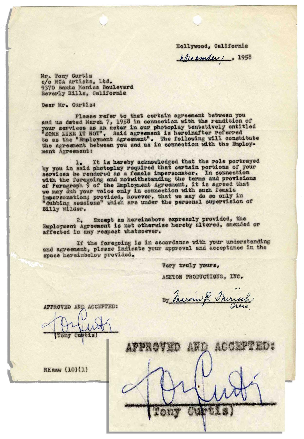 Historic Tony Curtis signed contract for the 1959 classic ''Some Like it Hot.'' Contract, on one page, is dated 1 November 1958 and grants director Billy Wilder permission to dub Curtis' voice in certain portions of the film. Document, measuring 8.5'' x 11'' on thin copy paper is signed ''Tony Curtis'' boldly in blue ink, and has minor wear to edges, including a very small tear to bottom left corner and two holes punched at top. Near fine condition overall.