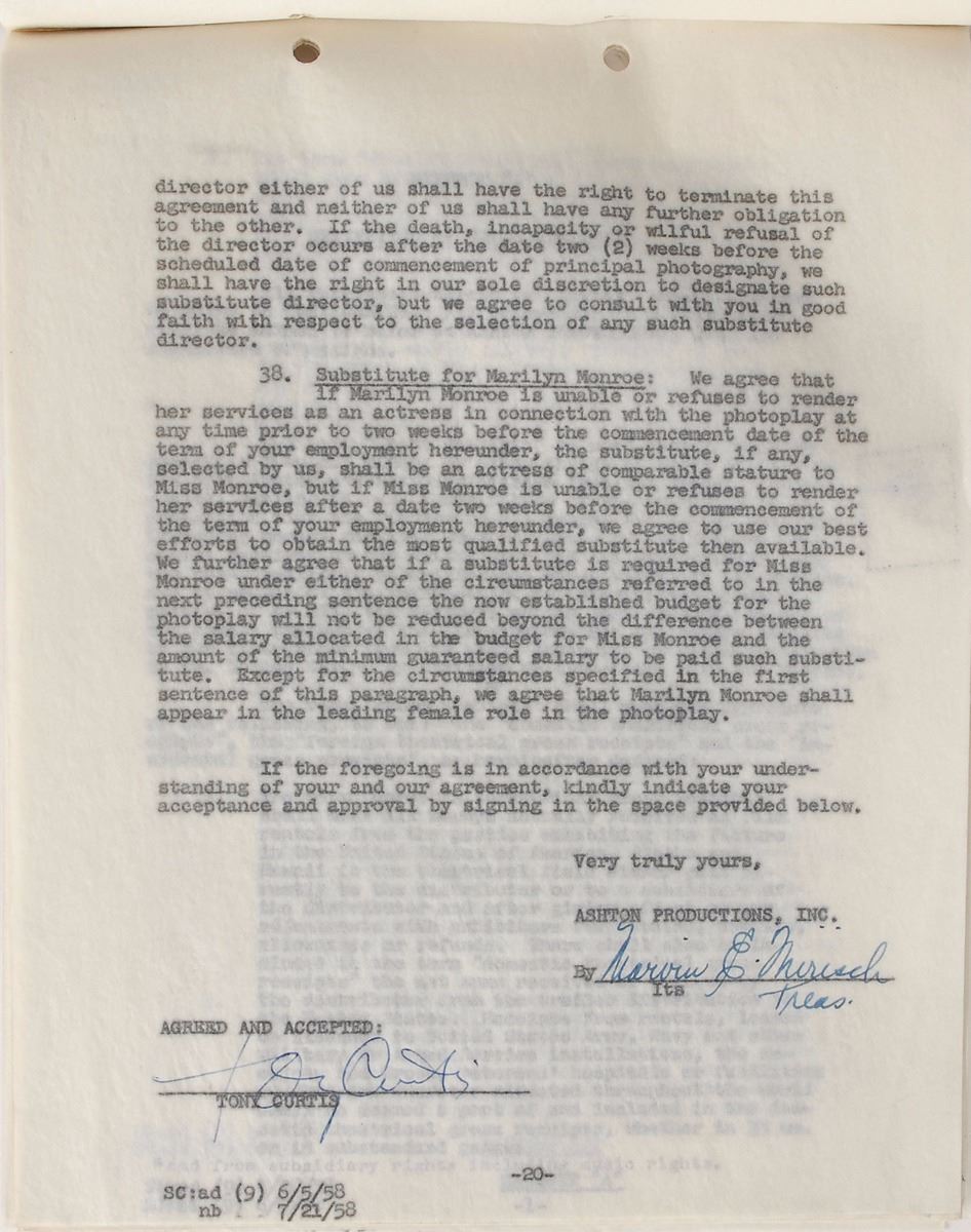 Exceptional DS, twenty onionskin pages, 8.5 x 11, March 7, 1958. Agreement between Curtis and MCA Artists in which the former agrees “to portray the role of Joe in our photoplay tentatively entitled ‘Some Like It Hot’” for a proposed “rate of Ten Thousand Dollars…per week.” Signed at the conclusion of the last page in blue ink, “Tony Curtis,” and initialed five times throughout the document, “TC.” Curtis has likewise initialed his name four more times on attached riders detailing gross receipts and royalties. In fine condition. Despite never being granted a certificate of approval from the MPPA, Billy Wilder’s Some Like It Hot became a monster hit in 1959, due in large part due to the appeal of its all-star cast of Curtis, Jack Lemmon, and Marilyn Monroe. An incredible document related to the formation of a true American classic.