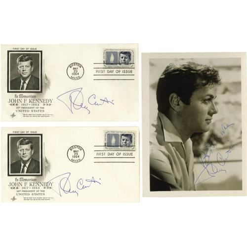 <B>Tony Curtis Signed Photo and Envelopes.</B></I> Includes a b&w 5" x 7" photo inscribed and signed by Curtis in blue ballpoint, plus two first day covers dated May 29, 1964 commemorating the death of President John F. Kennedy, both signed by Curtis in blue ink. All are in overall Excellent condition with mild wear. <I>Accompanied by LOA from PSA/DNA.</B></I><BR><BR><b>Shipping:</b> Flat Material, Small (<a target="_blank" href="http://www.heritageauctions.com/common/shipping.php">view shipping information</a>)