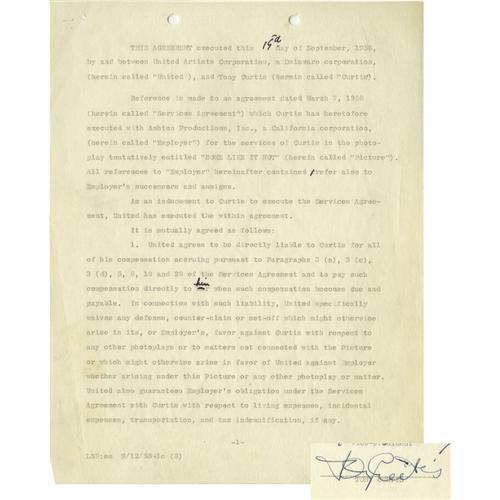 <B>Tony Curtis Signed "Some Like It Hot" Contract.</B></I> A four page contract dated September 19, 1958, regarding Curtis' appearance in the classic comedy. A highlight of Curtis' career, it's also ranked #1 on the AFI's list of greatest comedies and #14 on their list of greatest American films. In Very Fine condition with mild overall tanning and staple and binder holes to the top edge. <I>Accompanied by LOA from PSA/DNA.</B></I><BR><BR><b>Shipping:</b> Small Flat (<a target="_blank" href="http://www.heritageauctions.com/common/shipping.php">view shipping information</a>)