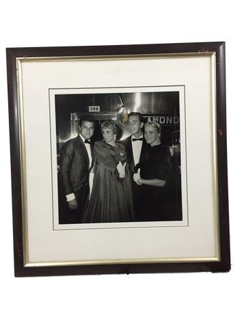 Brown picture frame with gold inner lining and glass. Image of Tony Curtis and Elizabeth Taylor with friends at formal event. Image is in black and white. An artcare archival system museum seal is stamped on the back of the frame. Measures 31"x32". Note: We can look into removing the frame from this item to save money on shipping charges.