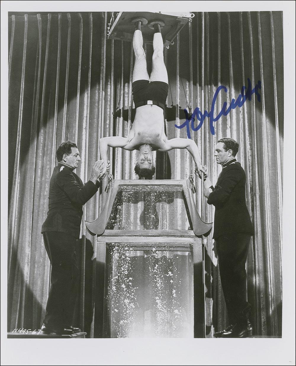 Glossy 8 x 10 photo of a bare-chested Curtis as Houdini suspended by his ankles, signed in blue felt tip, “Tony Curtis.” In fine condition.