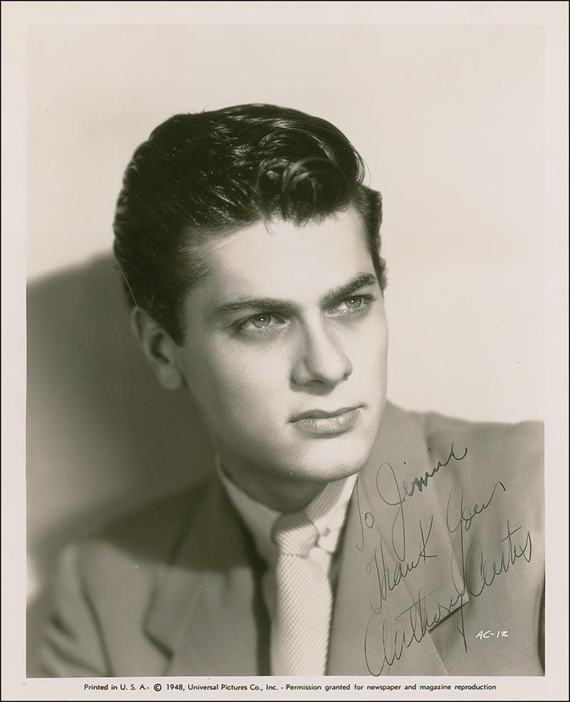 Handsome vintage glossy 8 x 10 Universal publicity photo from 1948, signed and inscribed in fountain pen “To Jimmie, Thank you, Anthony Curtis.” In fine condition, with paperclip impression to top edge, a few light creases, and some slight pooling of ink to inscription.