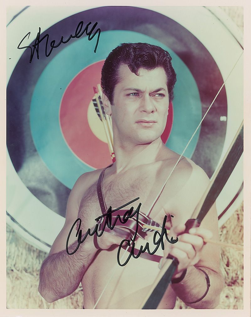 Color glossy 8 x 10 photo of Curtis with a bow and arrow, signed and inscribed in-person in black felt tip “Sterling, Anthony Curtis.” In fine condition, with a small ding to the bottom edge. An unusual ‘full name’ signed Curtis photo.