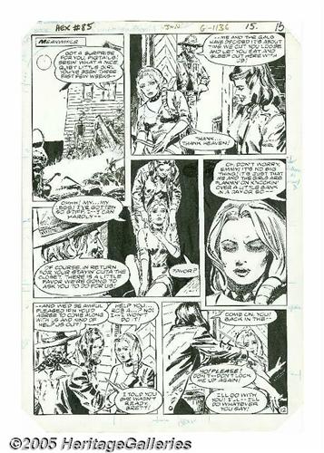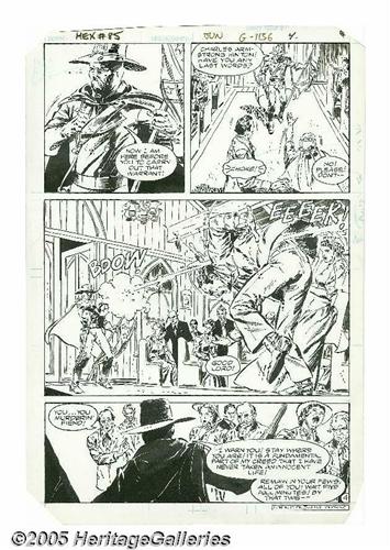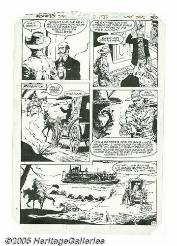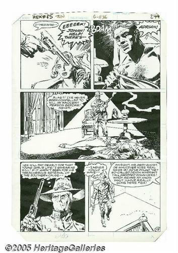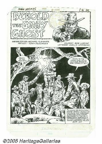 <B>Tony DeZuniga - Jonah Hex #85, Complete 23-page Story "Behold the Gray Ghost" Original Art (DC, 1984).</B></I> Jonah Hex battles the menace of the Gray Ghost in this fast-moving Michael Fleisher story, beautifully illustrated by the talented Tony DeZuniga. As Shaun Clancy noted in his introduction for a Tony DeZuniga interview in <B>Comic Book Artist</B></I> V2#4, "Tony DeZuniga exploded on the scene at DC Comics in the early 1970s -- the first of a Tsunami of Filipino artists to arrive in the U.S. -- most significantly as co-creator and artist of Jonah Hex, the 'Weird Western' anti-hero." The image area of each page is 10" x 15". The corners of the pages have been clipped outside the image area and there are a few missing pasted-on lettering corrections; otherwise the art is in Excellent condition. Here's a chance to win a great Tony DeZuniga story featuring his most famous co-creation!