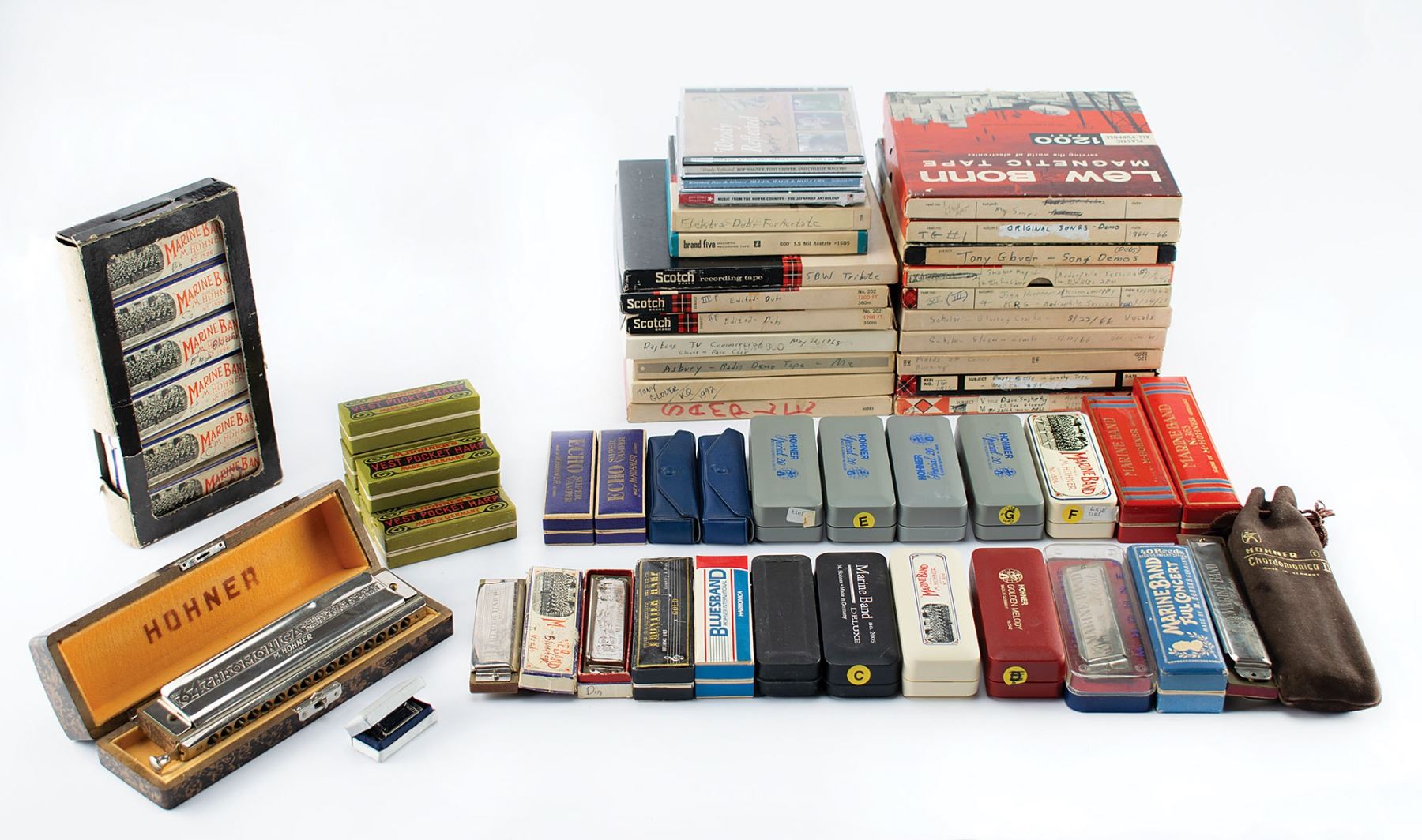 Tony Glover’s collection of harmonicas, musical recordings, and ephemera from his years as a blues and folk musician, which includes an impressive total of 53 M. Hohner harmonicas. The archive is as follows: an attractive 64 Chromonica professional model harmonica by M. Hohner, housed in its original case, which is marked on the bottom, “Nr. 280”; a wooden box with lid marked “Caution Radioactive Material,” which contains a set of 11 vintage Special 20 and Marine Band harmonicas by Hohner; a box of six Marine Band harmonicas by Hohner, each marked on the box top by Glover with the corresponding key; an assortment of 27 harmonicas, all of which are made by Hohner, which includes variations of Golden Melody, Marine Band, Blues Band, Special 20, Gold Frontier, Chordomonica, and Echo Super Vamper harps, the majority in their original box; a case containing eight M. Hohner’s Vest Pocket Harps, each with their original box marked with key: A, B, Bb, C, D, E, F, G; a Kent WC-17 harmonica pick-up with original box; a promotional poster for Koerner, Ray & Glover’s debut 1963 album Blues, Rags and Hollers, which mentions a meet-and-greet at “The Coffee Break, Oak & Washington Ave., (Next t Campus Theater)”; a poster for a “Thanksgiving Feast” featuring Koerner, Ray & Glover at the World Theater on November 27th; a “Woody Reflected” CD signed by Glover, Pop Wagner, and Charlie Maguire; a Red House Records CD reissue of Blues, Rags and Hollers by Koerner, Ray & Glover, with all three signing in black ink; a still-sealed CD entitled Music from the North Country—The Jayhawks Anthology; a master record for Ashes in My Whiskey by David Ray and Glover; a Nick Manoloff Modern Accompaniment Guide for Spanish guitar; and 11 pages of Glover’s handwritten recording notes.