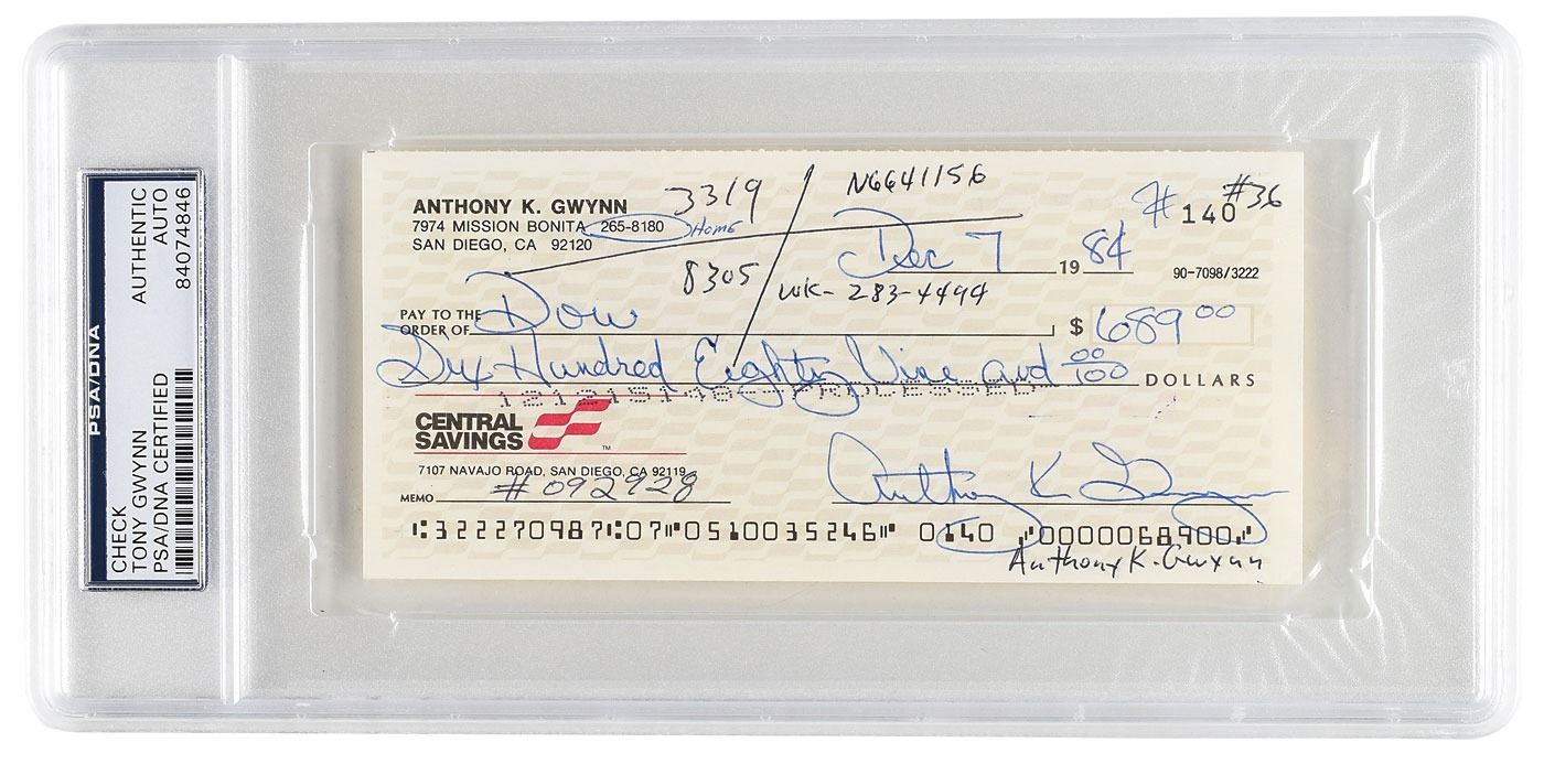 Personal check, 6 x 2.75, filled out and signed by Gwynn, "Anthony K. Gwynn," payable to Dow for $689, December 7, 1984. Encapsulated in a PSA/DNA authentication holder. In fine condition. Gwynn won his first of eight National League batting titles in 1984, while also earning his first Silver Slugger Award and All-Star selection.