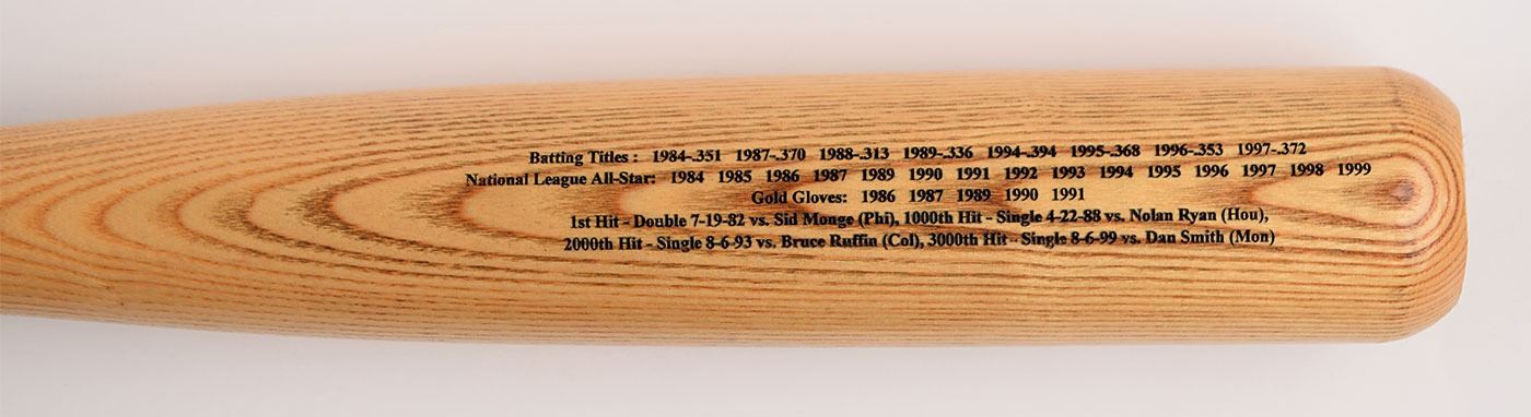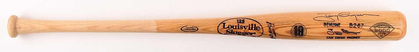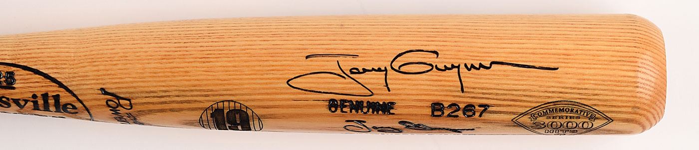 Official limited edition Louisville Slugger Tony Gwynn signature-model baseball bat engraved to honor his achievement of 3,000 hits, numbered 1358/3000, signed in black felt tip on the barrel by Gwynn. The opposite side of the barrel is engraved with his many accolades, including batting titles, All-Star appearances, Gold Glove awards, and landmark hits. In fine condition.