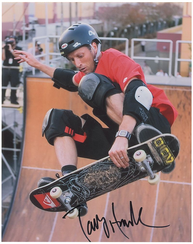Color glossy 8 x 10 photo of Hawk in mid-air on his skateboard, signed in-person in black felt tip. In fine condition.