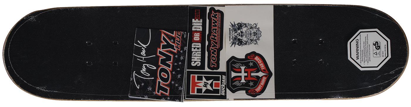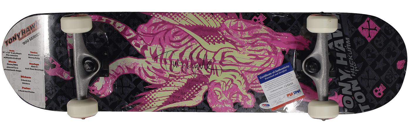 Visually stunning Tony Hawk Huckjam Series skateboard, signed on the bottom in black felt tip by Hawk. In very fine condition (the board is unused and still sealed except where Hawk has signed it). Accompanied by a certificate of authenticity from PSA/DNA with a sticker affixed to the bottom of the board. RRAuction COA.