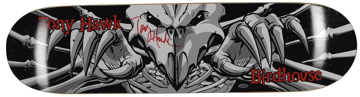 Visually stunning Tony Hawk Birdhouse Flying Falcon 3 skateboard (minus wheels), signed on the bottom in red felt tip by Hawk. In very fine condition, with a Steiner hologram affixed to board. Accompanied by a certificate of authenticity from Steiner.