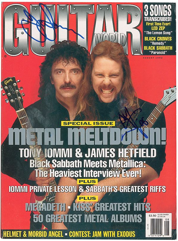 Guitar World magazine, dated August 1992, featuring Iommi and Hetfield on the cover, signed on the cover in blue felt tip by both Iommi and Hetfield. In fine condition.