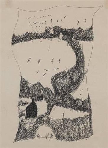 <B>Tony O'Malley HRHA (1913-2003)</B><BR>NANCLEDRA LANDSCAPE<BR>signed with initials and dated [1 January 1974] lower left; inscribed and signed again on reverse<BR>pen and ink on paper<BR>25 by 18cm., 10 by 7in.<BR>Provenance:<BR>Purchased by the present owner in St. Ives, 1988 Nancledra is a village in Cornwall.