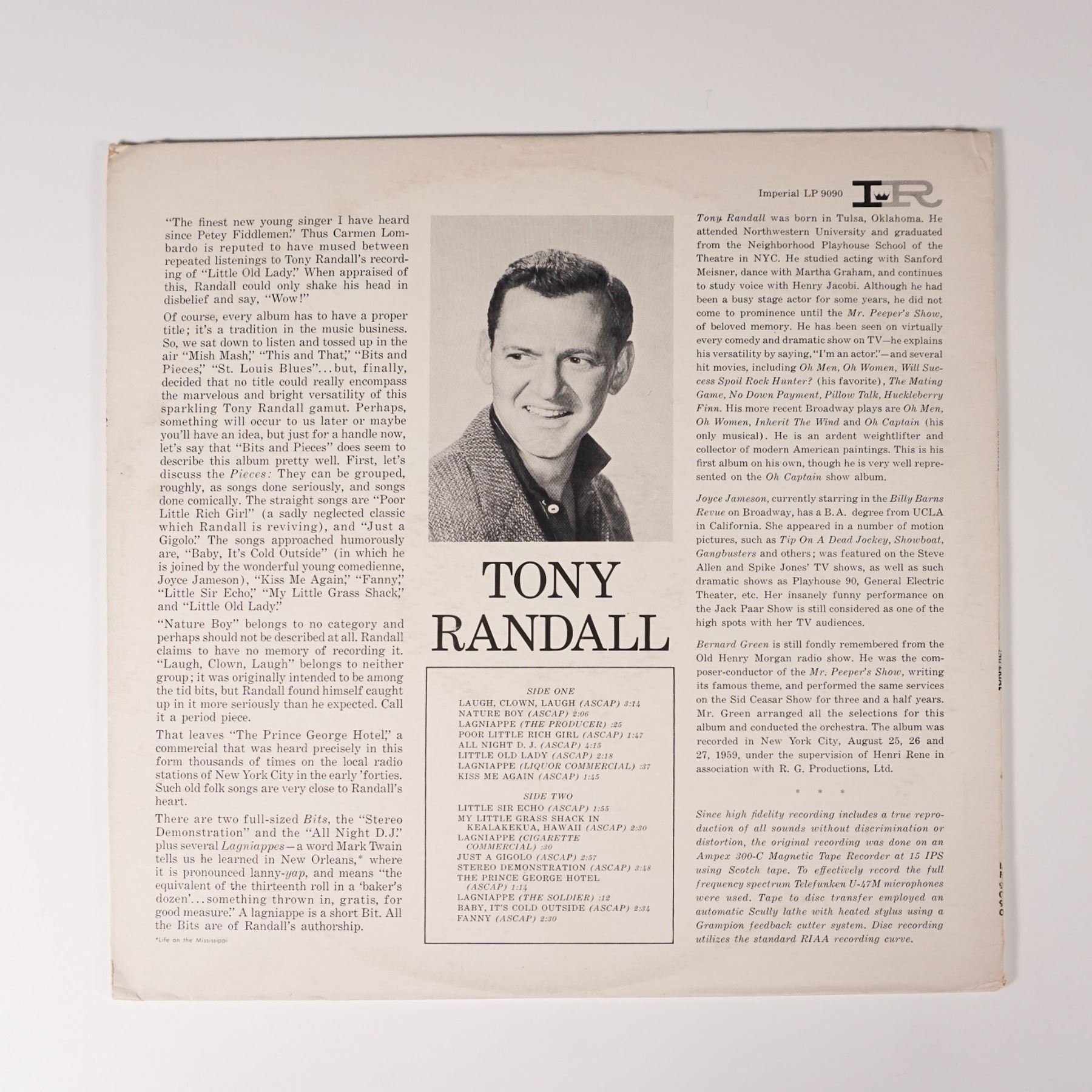 Vintage Tony Randall LP album released by Imperial Records, catalog number LP-9090. This high-fidelity record features the renowned actor and comedian performing a mix of songs and spoken-word pieces, showcasing his wit and musical talent. The cover art presents a striking illustrated portrait of Randall, while the back includes detailed liner notes and a tracklist. The record label displays the Imperial branding with a colorful starburst design. A must-have for collectors of classic vinyl and mid-century entertainment memorabilia.