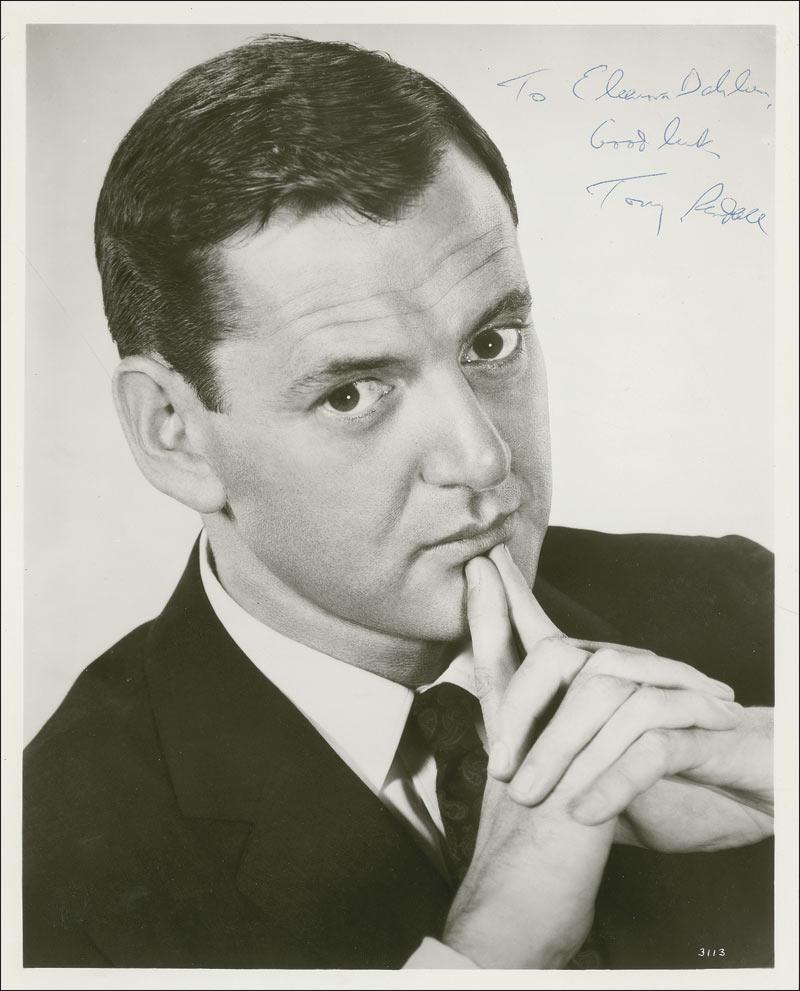 Vintage glossy 8 x 10 head-and-shoulders photo of Randall in a pensive pose, signed and inscribed in blue ballpoint “To Eleanora Dahler, Good luck, Tony Randall.” In fine condition, with light scattered surface creasing.