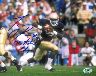 Tony Rice was Notre Dame's first black full-time starting national champion quarterback. Rice was one of the cornerstones on Notre Dame's 1988 national championship team which went 12-0 and defeated West Virginia in the Fiesta Bowl. He holds the school record for rushing yardage by a quarterback in a season 884 in 1989 and a career 1921 ranking 16th among all Irish players in the latter category. Rice also stands sixth in school history with 4882 yards of total offense. Tony Rice has hand signed this 8x10 photograph with 1988 National Champs inscription. MAB Hologram and Certificate of Authenticity from Athlon Sports.