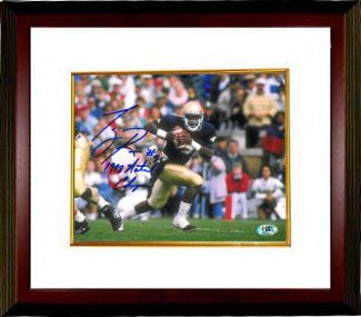 Tony Rice was Notre Dame's first black full-time starting national champion quarterback. Rice was one of the cornerstones on Notre Dame's 1988 national championship team which went 12-0 and defeated West Virginia in the Fiesta Bowl. He holds the school record for rushing yardage by a quarterback in a season 884 in 1989 and a career 1921 ranking 16th among all Irish players in the latter category. Rice also stands sixth in school history with 4882 yards of total offense. Tony Rice has hand signed this 8x10 photograph with 1988 National Champs inscription. MAB Hologram and Certificate of Authenticity from Athlon Sports. Custom White Mat and Premium Mahogany Frame as shown.