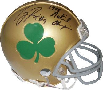 Tony Rice was Notre Dame's first black full-time starting national champion quarterback. Rice was one of the cornerstones on Notre Dame's 1988 national championship team which went 12-0 and defeated West Virginia in the Fiesta Bowl. He holds the school record for rushing yardage by a quarterback in a season 884 in 1989 and a career 1921 ranking 16th among all Irish players in the latter category. Rice also stands sixth in school history with 4882 yards of total offense. Tony Rice has hand signed this Notre Dame Fighting Irish Green Shamrock Logo Mini Helmet and added the inscription 1988 National Champions. MAB Hologram and Certificate of Authenticity from Athlon Sports is included.
