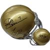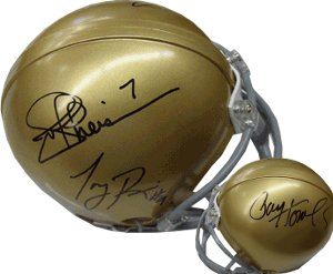 Joe Theismann attended and played college football for the University of Notre Dame. In 1969, Theismann led the Irish to a number five ranking and their first bowl appearance in 45 years. The next year, the Irish had a 10–1 record, a number two ranking, and won against Texas in the 1971 Cotton Bowl Classic, 24–11. Theisman was inducted into the College Football Hall of Fame in 2003. Paul Hornung could do it all. After a college career at Notre Dame in which he excelled at both basketball and football, the 1956 Heisman Trophy winner entered the NFL and quickly made his mark with the Green Bay Packers. Hornung put up big stats as a running back, receiver, kicker and occasional passer over the years and earned numerous awards, including NFL Player of the Year honors in 1960 and 1961 and enshrinement in the Hall of Fame in 1986. Tony Rice was part of the 1988 Notre Dame football team that would claim their first National Championship in 11 years. For the season the team would go a perfect 12–0 enroute to claiming an NCAA-record eighth AP National Championship since the poll began in 1936. Notre Dame quarterback greats hand autographed 3 signature mini helmet. Signatures include: Joe Theismann, Paul Hornung, and Tony Rice. Global Hologram and Certificate of Authenticity.