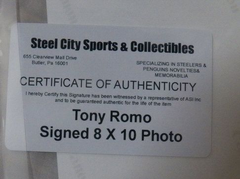 Tony Romo 8" x 10" signed Photograph with COA from Steel City Sports & Collectibles