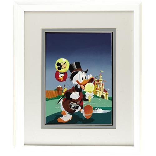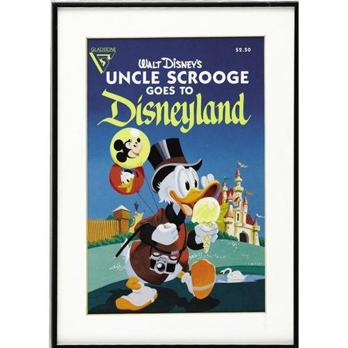 <B>Tony Strobl - Uncle Scrooge Goes to Disneyland Cover Original Art (Dell, 1957).</B></I> A dapper Uncle Scrooge plays tourist in the bosom of Disneyland, in this marvelous cover illustration which was originally published in the 100 page special, <B>Uncle Scrooge Goes to Disneyland</B></I>. Gladstone Publishing launched a new line of Disney comic books with a reprint of this book, which features this same art on its cover. Painted in watercolor, the image area measures 10.5" x 14.5". Matted and framed and in Excellent condition. Includes a cover proof and a copy of the Gladstone comic, which have also been matted and framed, and are in Excellent condition. <I>From the Estate of Bruce Hamilton</B></I>. <BR><BR><B>Important notice:</B> Heritage usually auctions material at the rate of 200-250 lots per hour. On some occasions eBay Live bid software or the Internet may not be able to keep up with the pace of the auction. We recommend placing a realistic absentee bid now as insurance to avoid disappointment. Occasionally the auctioneer may eliminate or reject an eBay Live bid, and the auctioneer may also reopen a lot after the close of the eBay live bidding (usually because we missed an audience bid), and may reject your bid even if it shows you as the winning bidder. By bidding via eBay Live, you agree that Heritage may award the lot to another bidder at its sole discretion under the circumstances described above or any other reasonable circumstances. Since eBay bids are not shown to us until we open the lot on the floor, we treat those bids just like floor bids. In most cases the floor responds before the eBay bid is presented to us, due to Internet lag time, so for consistency we have made it a policy that floor bids are always considered first over tie eBay live bids. Also please note that all Heritage lots purchased through eBay Live carry a 22.5% Buyer's Premium. Please make sure you read the Terms and Conditions before you bid. This lot is being auctioned in conjunction with a live floor auction by Heritage Auction Galleries. All final auction and invoice information will be supplied by Heritage Auction Galleries, and all other information should be considered preliminary. Lot:41001 <BR><BR><B>Winning Notification and Billing:</B> After the FINAL session in this auction is complete, Heritage will send e-mail and snail mail invoices. This process normally takes several days. All final auction and invoice information will be supplied by Heritage Auction Galleries, and all other information should be considered preliminary. <BR><BR>This auction will be conducted on a live auction floor and over the Internet through eBay Live. If you choose to place an absentee bid, please take a moment to <font color='#0000ff'><u><a href='http://pages.ebay.com/liveauctions/help/before/laabsentee.html'>learn how eBay Live absentee bidding works</a></u></font><font color='#000000'>
