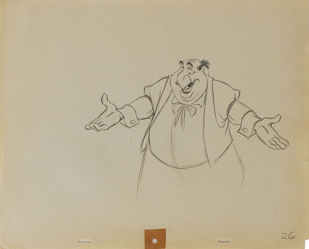(Walt Disney Studios, 1955) Original production drawing featuring Tony from Lady and the Tramp, from John Lounsbery’s ‘Bella Notte’ sequence. Accomplished in graphite on untrimmed 15.5 x 12.5 animation paper. Image measures 10.25 x 6.5. In fine condition, with paper loss to lower right corner tip.