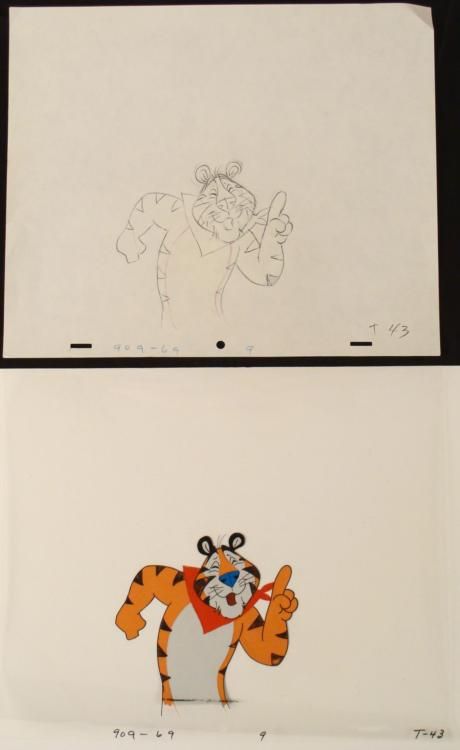 Now let me tell you something about my Frosted Flakes... * * * Original Drawing and Animated Cel Original "rough" animation drawing, in non-photo blue and black with the notations in non-photo blue * * Overall size is a 12-field drawing that is 10 1/2" × 12 1/2" * Overall Size of the Cels: 10 1/2" x 12 1/2" * Very Good Condition * * * This is an original hand-painted cel set-up used in the production of the "Frosted Flakes Commercial." Each one-of-a-kind set-up represents a slight change in position of the characters. When * individually photographed and projected in rapid succession, the images appear to move. * * To create production cels, the original animator's drawing is transferred onto an acetate cel (by hand-inking and/or photo copying). * * * * * * * The cel received by the winning bidder may be ever so slightly different from the one in the auction photos. * * * * * The cel and drawing are ready to be matted and framed. The animator's notations are at the bottom of both. * *