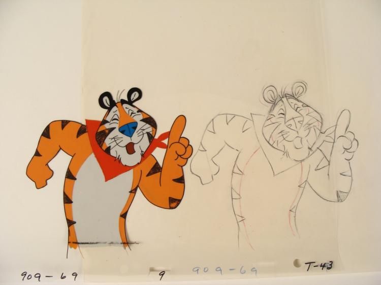 Now let me tell you something about my Frosted Flakes... * * * Original Drawing and Animated Cel Original "rough" animation drawing, in non-photo blue and black with the notations in non-photo blue * * Overall size is a 12-field drawing that is 10 1/2" × 12 1/2" * Overall Size of the Cels: 10 1/2" x 12 1/2" * Very Good Condition * * * This is an original hand-painted cel set-up used in the production of the "Frosted Flakes Commercial." Each one-of-a-kind set-up represents a slight change in position of the characters. When * individually photographed and projected in rapid succession, the images appear to move. * * To create production cels, the original animator's drawing is transferred onto an acetate cel (by hand-inking and/or photo copying). * * * * * * * The cel received by the winning bidder may be ever so slightly different from the one in the auction photos. * * * * * The cel and drawing are ready to be matted and framed. The animator's notations are at the bottom of both. * *