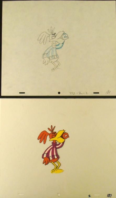 You win, you win... I can't listen to you anymore... * Original Cel and Drawing * * AnimationOriginal "rough" drawing in black and * non-photo blue pencil with the notations in blackOverall size is a 12-field drawing that is 10 * 1/2" x 12 1/2"Size of cel: 10 1/2" x 12 * 1/2"Very good * condition * This is an original * hand-painted cel used in the production of * the "Coco Puffs" TV commercial. Each cel represents a slight * change in position of the characters. When individually photographed and * projected in rapid succession, the images appear to move.To * create production cels, the original animator's drawing is transferred * onto an acetate cel (by hand-inking and/or photo copying). The cel is * then hand-painted on the reverse side. * * * The drawing and cel are ready to be matted and * framed. The animator's notations are located at the bottom of * both. *