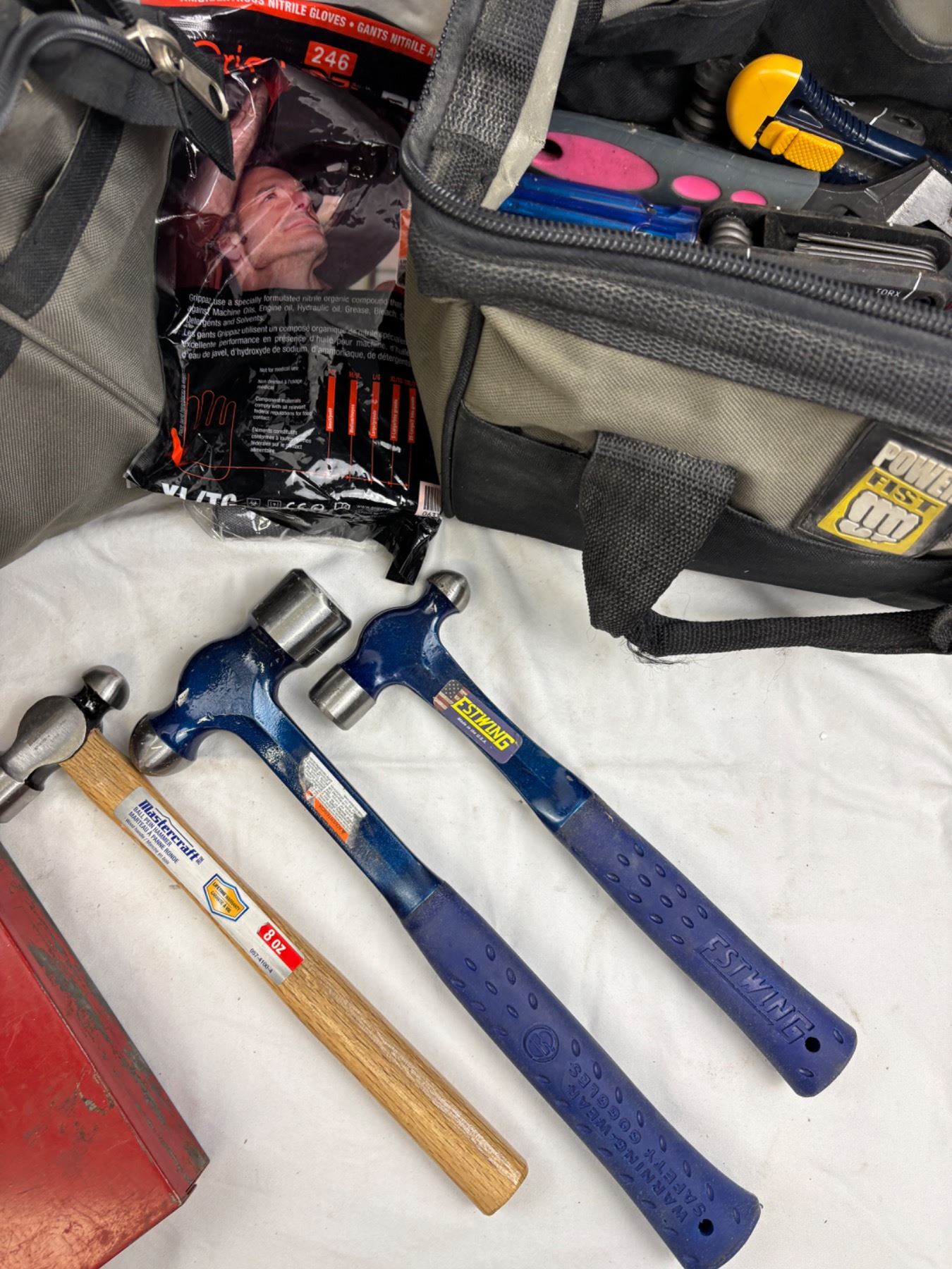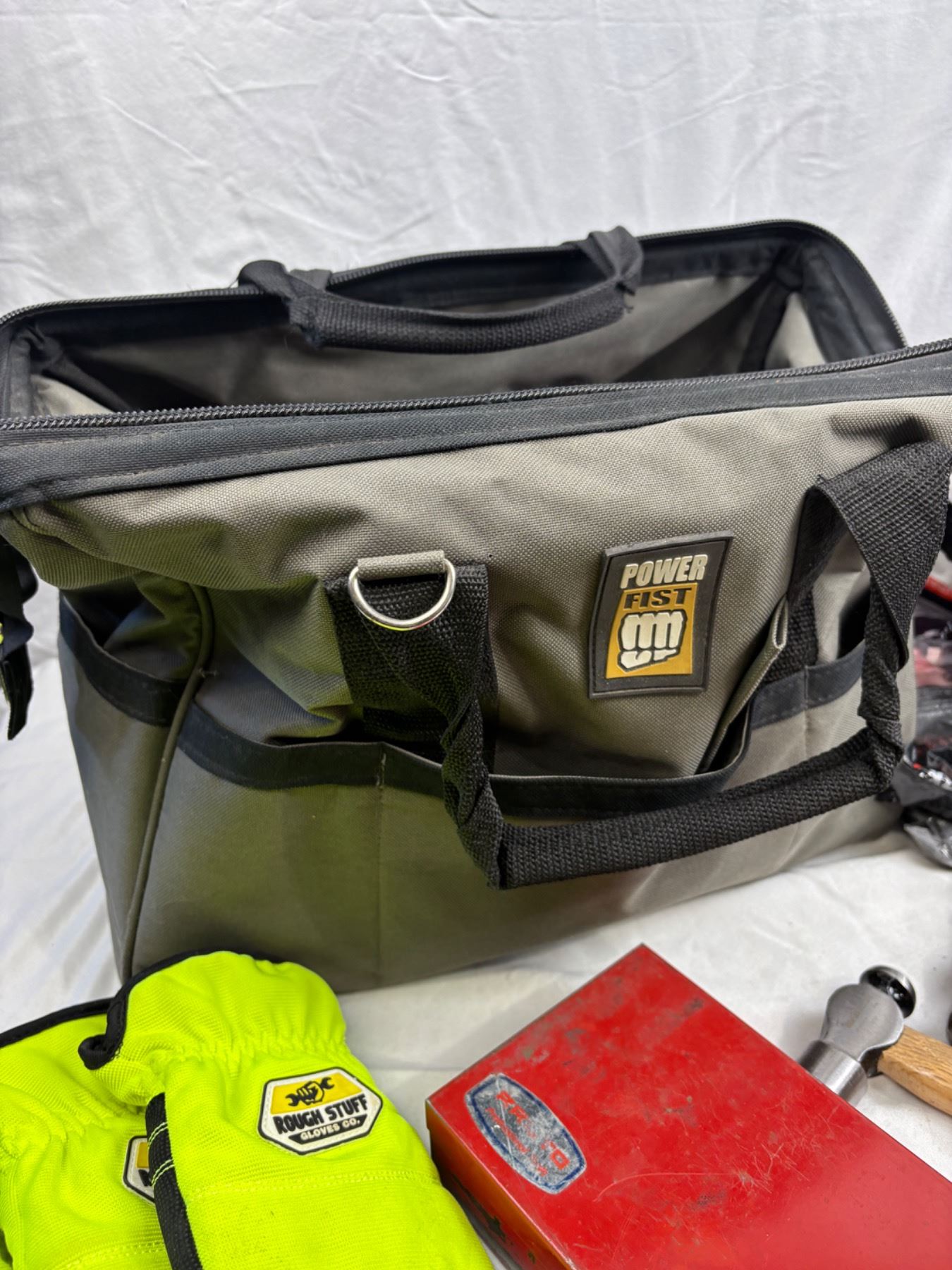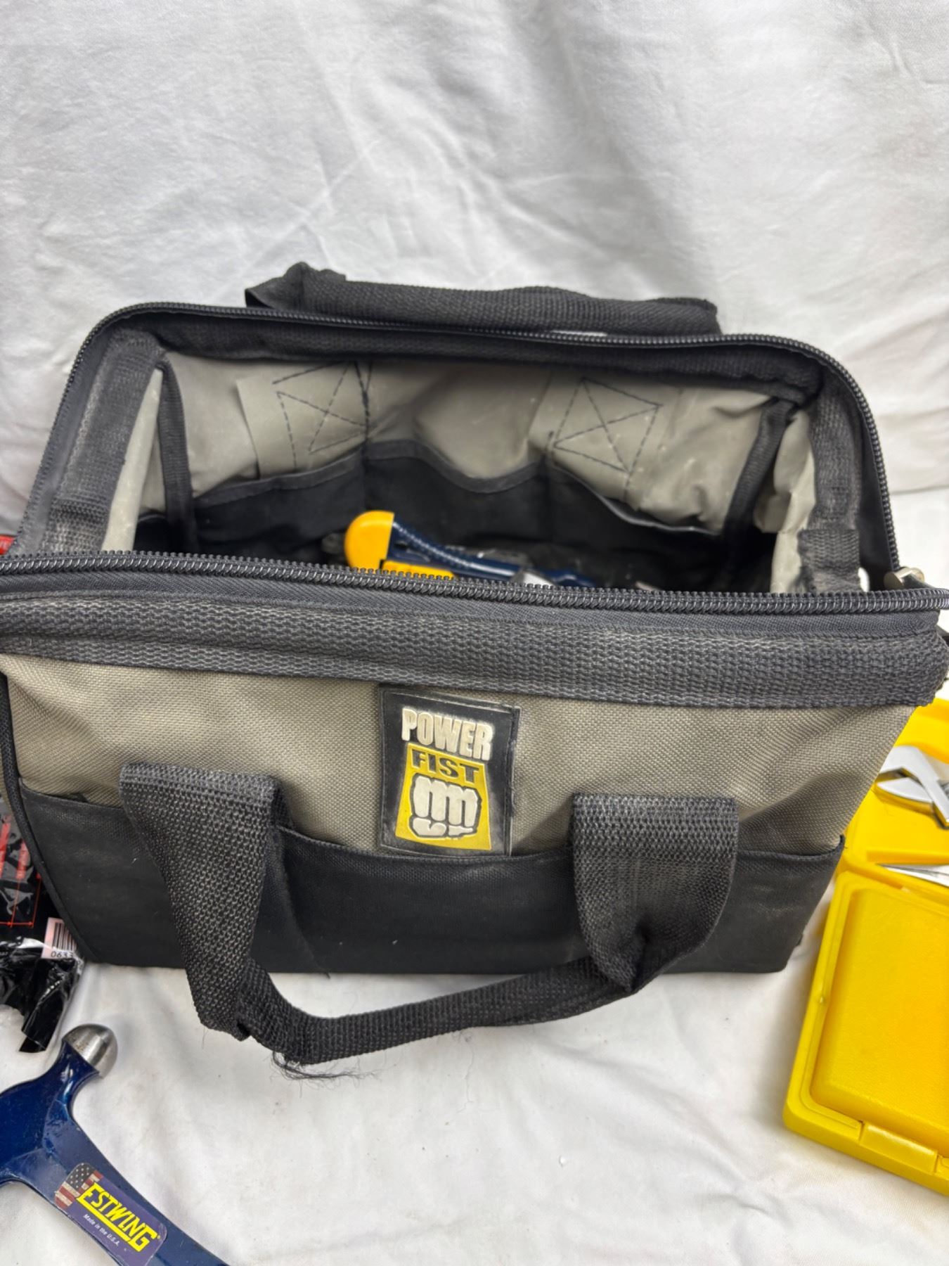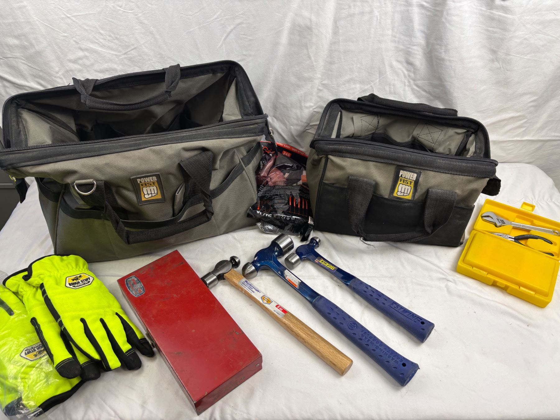 Includes two Power Fist tool bags (some wear), various hand tools with brands like Estwing, Procor, Huskey, and more