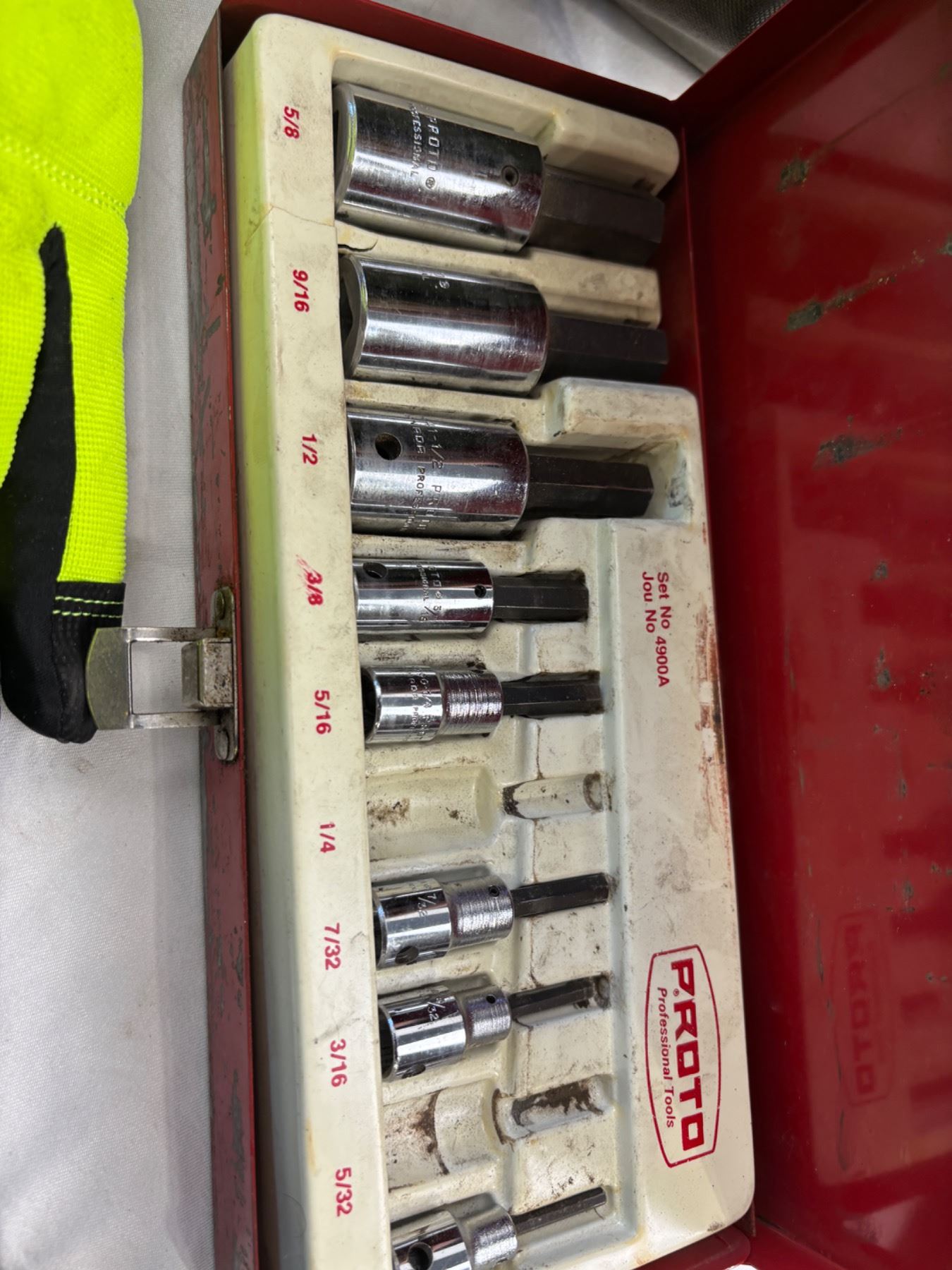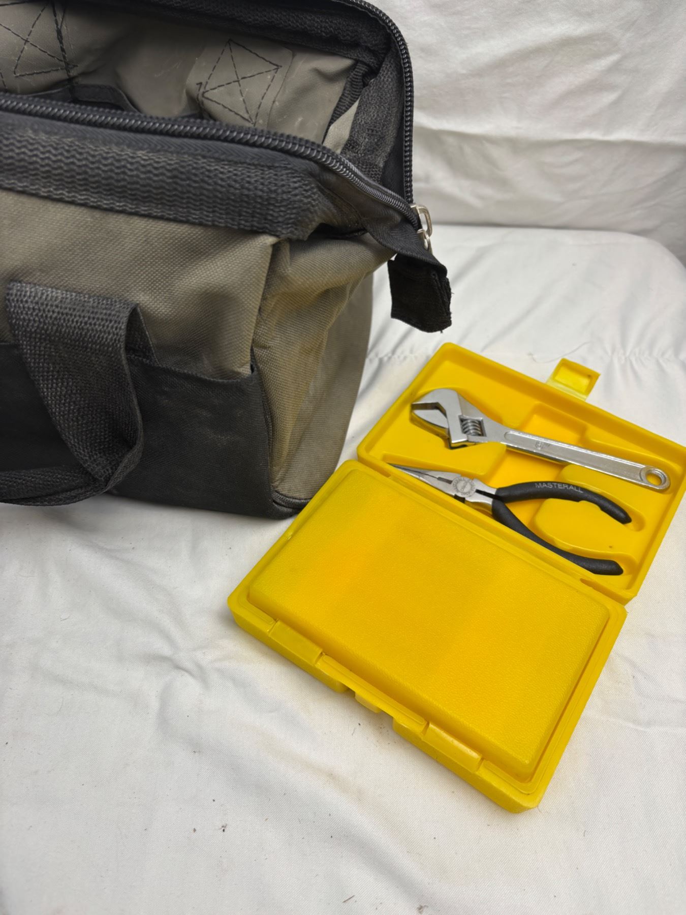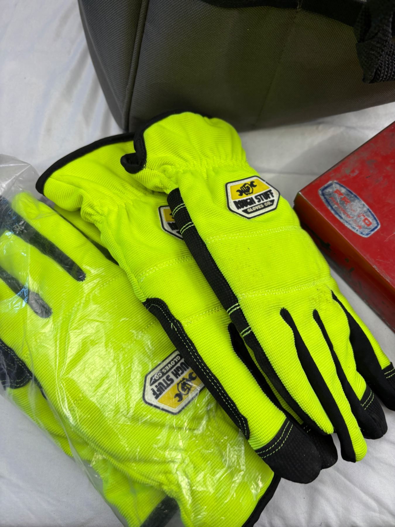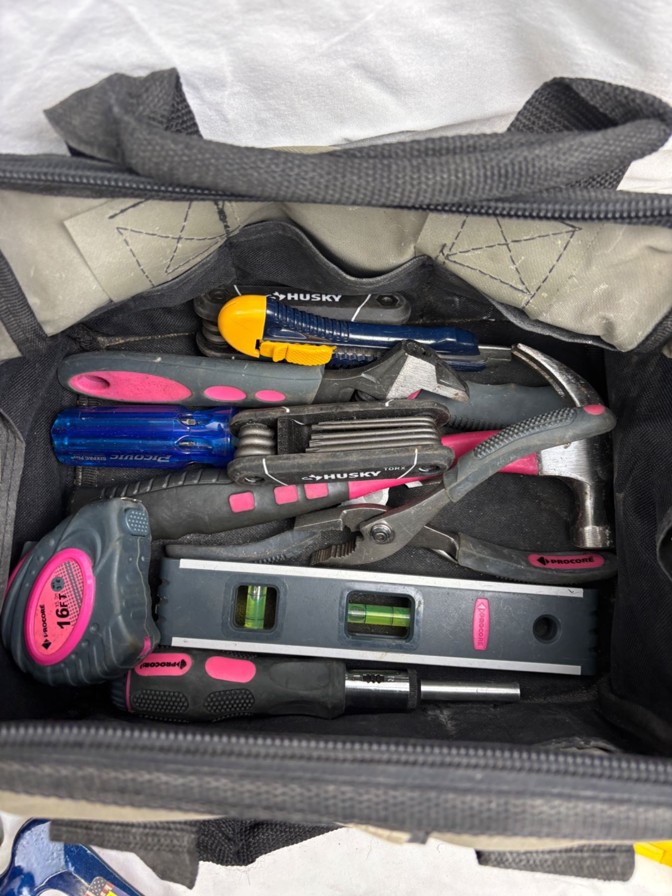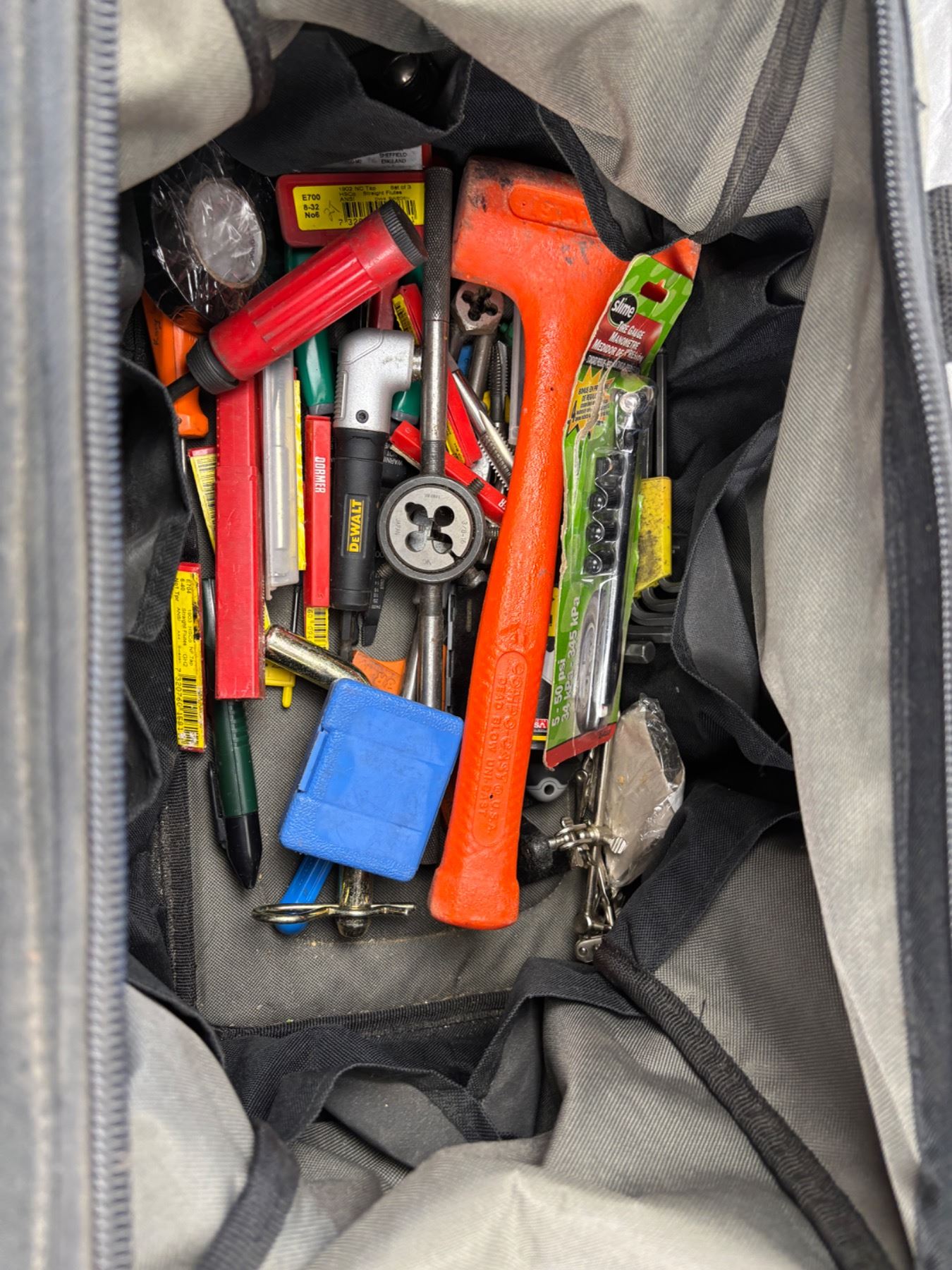 Includes two Power Fist tool bags (some wear), various hand tools with brands like Estwing, Procor, Huskey, and more