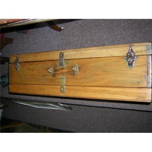Old, hand made pine tool box. Opens on both sides. Has space for hand saw and drawer with three sections for small items. There are handles on each side for easy carrying.